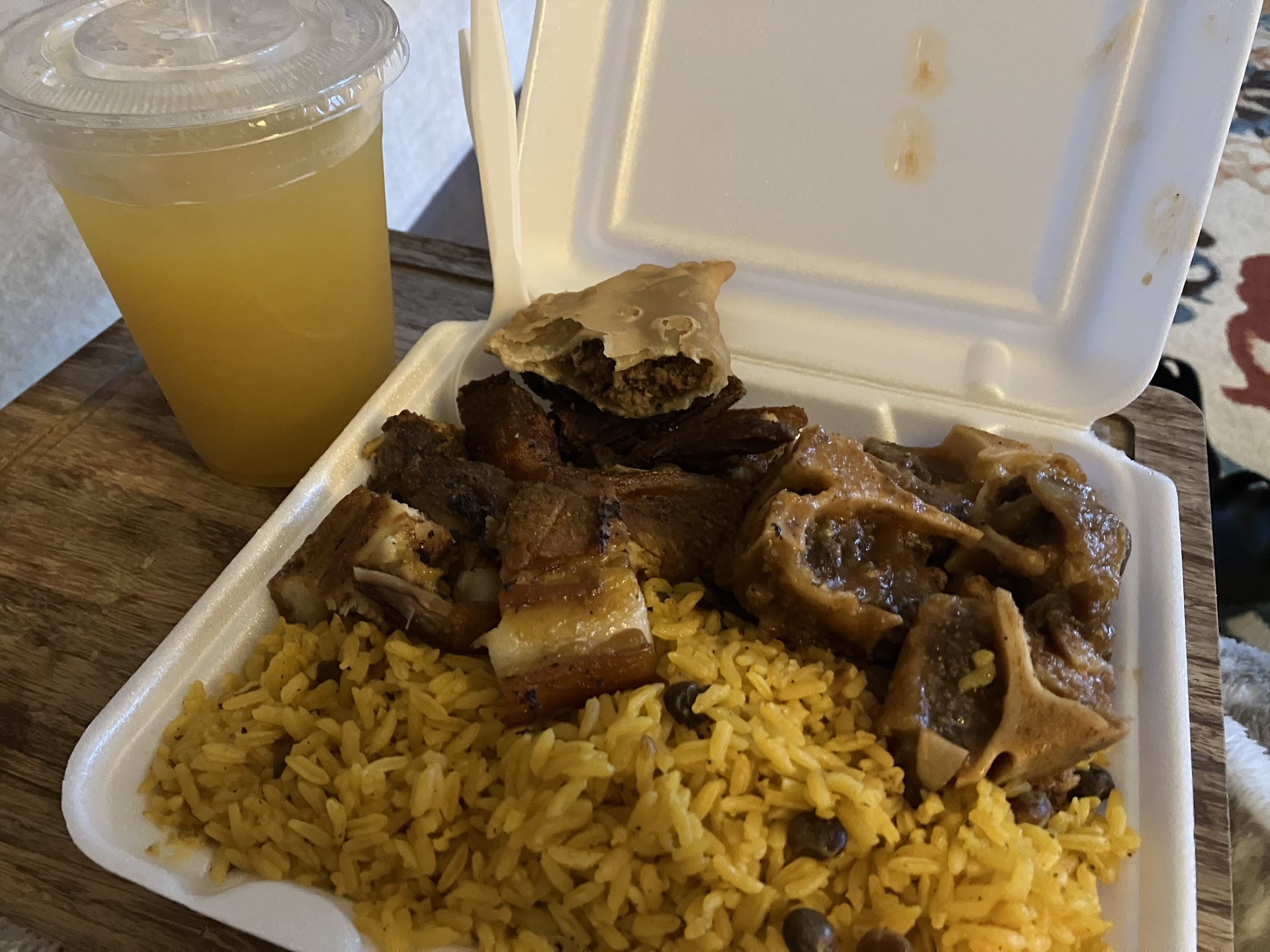 The potato salad tasted more in line with industry standard vs Dominican style. The fried pork belly had the signature crunch and tender meat. The Jamaican style beef patties were too greasy and lacked flavor. Tasted like a discounted freezer item dunked in hot oil. The Mongu was okay and paired nicely with the pickled onions.