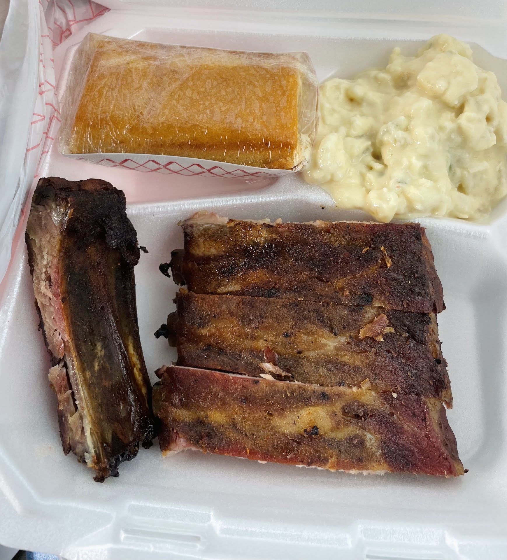 Read moreWe came here at 4 pm on a Sunday and it was just us in the restaurant. I ordered to go, we got the chicken/rib dinner combo with corn niblets and Mac and cheese and the rib dinner combo corn bread and potato salad and two extra sides of corn bread. We all loved the corn bread, it was sweet, buttery, and soft. I got honey to go with it but we didn’t need to add anything. I’m not a fan of potato salad but my husband is, he liked it. We did like the ribs, especially with the bbq sauce. Corn niblets were crunchy but not a ton of flavor, they have seasoning by the silverware, I should have added some. The Mac and cheese was a little mushy but had good flavor. The chicken, unfortunately, was really dry. I’d try the dark meat if we come again. Cute space with picnic tables,...