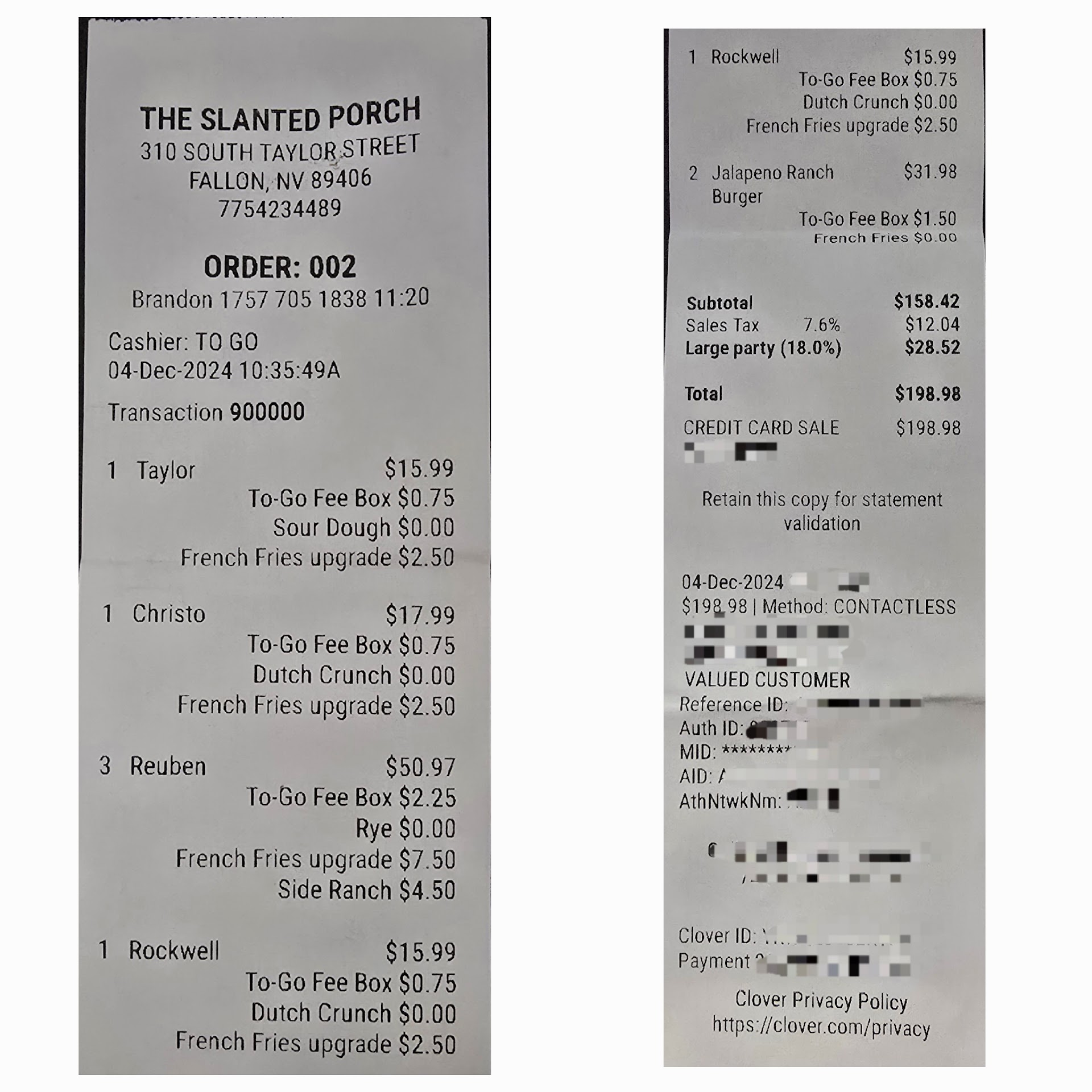 Our crew decided to do our lunch run to Slanted Porch. We know it's a little pricey but were wanting to treat ourselves. We had 8 orders that we called in to the restaurant 30 minutes before they even opened. We didn't want to slam them by just showing up. We were told it would be ready at 11:20 for pickup.