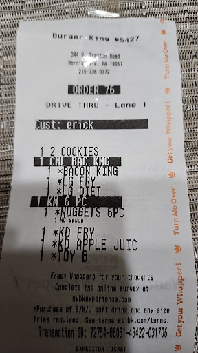 Ā Ā Ā Read moreThis Is Exactly Why I Stopped Going To This Burger King In Morrisville PA A YEAR Ago Because They Are Terrible Once Again I Ordered A Whopper With Cheese & Bacon Conbo And Once Again LITERALLY ONE LITTLE SLICE OF BACON Was Put On My Whopper I Also Got the halfies onion ring and ff my onion rings where RAW & STILL FROZEN Wen i bit into them SAME FOR THE FF OH AND MY DRINK THE DR. PEPPER I ordered was all seltzer THIS IS WHY I STOPPED GOING A YEAR AGO BECAUSE OF THIS SAME STUFF HAPPENING & THEIR EMPLOYEE'S WHERE RUDE AND THE FOOD SO THAT 2ND CHANCE I JUST GAVE TONIGHT IS JUST THAT 2ND & ABSOLUTELY THE LAST CHANCE I WILL NEVER EAT BURGER KING FROM HERE EVER AGAIN!!! WELL NOT FROM THIS LOCATION IF I EVER EAT IT AGAIN THIS LOCATION HAS MADE ME AFRAID TO SPEND MY MONEY AT A BK CAUSE I AM AFRIAD MY FOOD WILL BE RAW AND NOT WHAT I ORDERED BUT CHARGED FOR THE CHEESE & BACON AND MY DRINK SND ONION RINGS AND FF TO ONCE AGAIN GET RAW FROZEN FOOD!!! oh and I ordered some chicken fries some were over cooked and some were not cooked all the way and were frozen in the middle i just hope I don't get food poison from the raw...