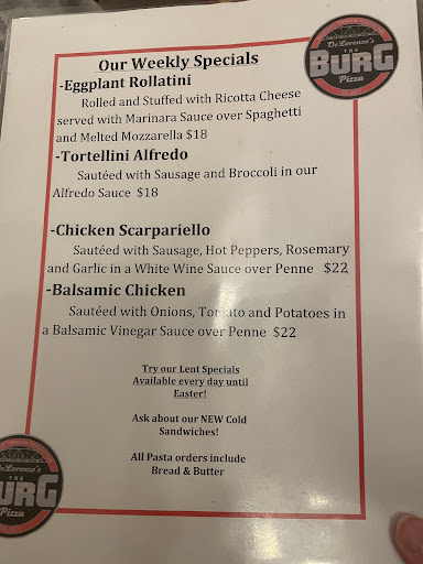 Read more5 stars if you dine in. Pizza always great as expected. We got takeout twice, pasta on October 4th and sandwiches on October 21st. Disappointing both times. Sparse amount of sauce on pasta but extremely generous with the actual pasta...we had to get dinner somewhere else then "doctor up" to eat on another day. The meatball appetizer, said to be large on the menu, was 2 meat balls cut in halves with a smallish amount of sauce for $3.50...they were very good but too little of them for the price. The Italian dog was cold when it arrived home...about a quarter mile... And the potatoes and peppers were still crunchy. The chicken cheese steak was dry with imperceptible cheese. When I called to inquire about the serving size of meatballs, the young manager adopted a sharp and resistant tone with me...when I mentioned that this was our second experience with less than generous takeout orders, he said he remembered our compaint from before, and began overtalking me and basically insinuating that I had lied the and was being unreasonable now. Oh, and he made some harsh remarks and hung up on me. I would usually wait until tomorrow voice my concerns to the owner, but this was so uncharacteristically awful I could not sleep on it before commenting. This is a place that has someone open the door for customers in and out, and yess ma'am no ma'am whatever you need ma'am, and our pleasure providing you excellent service come back soon. I am shocked and disappointed at the way our valid complaints and questions were so poorly received and reacted to. We encourage anyone who wants a great dine-in experience to try delorenzo's the burg pizza on new falls road. But be warned that they only like happy feedback from...