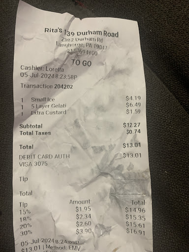 I stood in front of the window for about 6 minutes while nobody took the time to help me. Finally I knocked on the window and a woman came from the back on a phone and looked at me and walked out of view. Meanwhile it's 100° out and all I'm trying to do is patronize a local business. After 3 more minutes I knock on the window again and the woman finally ask me what I need. No apology or acknowledgment of the situation. I bought 6 quarts and they were out of two of the most popular flavors. It takes 20 more minutes to scoop the six quarts then they are placed on the counter without the employee writing down what flavors they are. I asked that she write down what is what and please place everything in a bag so I can get everything home. For some strange reason she doesn't double bag 6 quarts and I am terrified the whole way home that the bag will break and get all over my car. This was just a lot to deal with for simply trying to patronize a local business. There's another Rita's Water Ice the opposite way on New Falls Road that I can easily go to next time. But this was a very awkward experience just to spend $50...