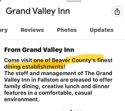 Again, the food and service was great! No complaints and very high quality. But the atmosphere is hurt by things like that shirt, unless that’s what the Grand Valley Inn is...