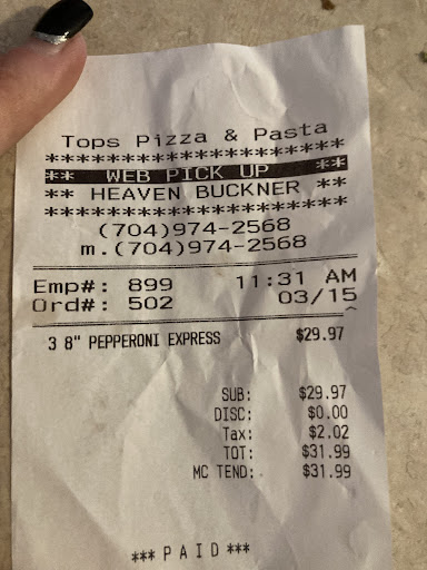 My experience with Tops Pizza and Pasta goes way back since 2019. I never had an issue so thatās why I rated 4 stars I will say yesterday when I ordered two medium pepperoni pizzas.