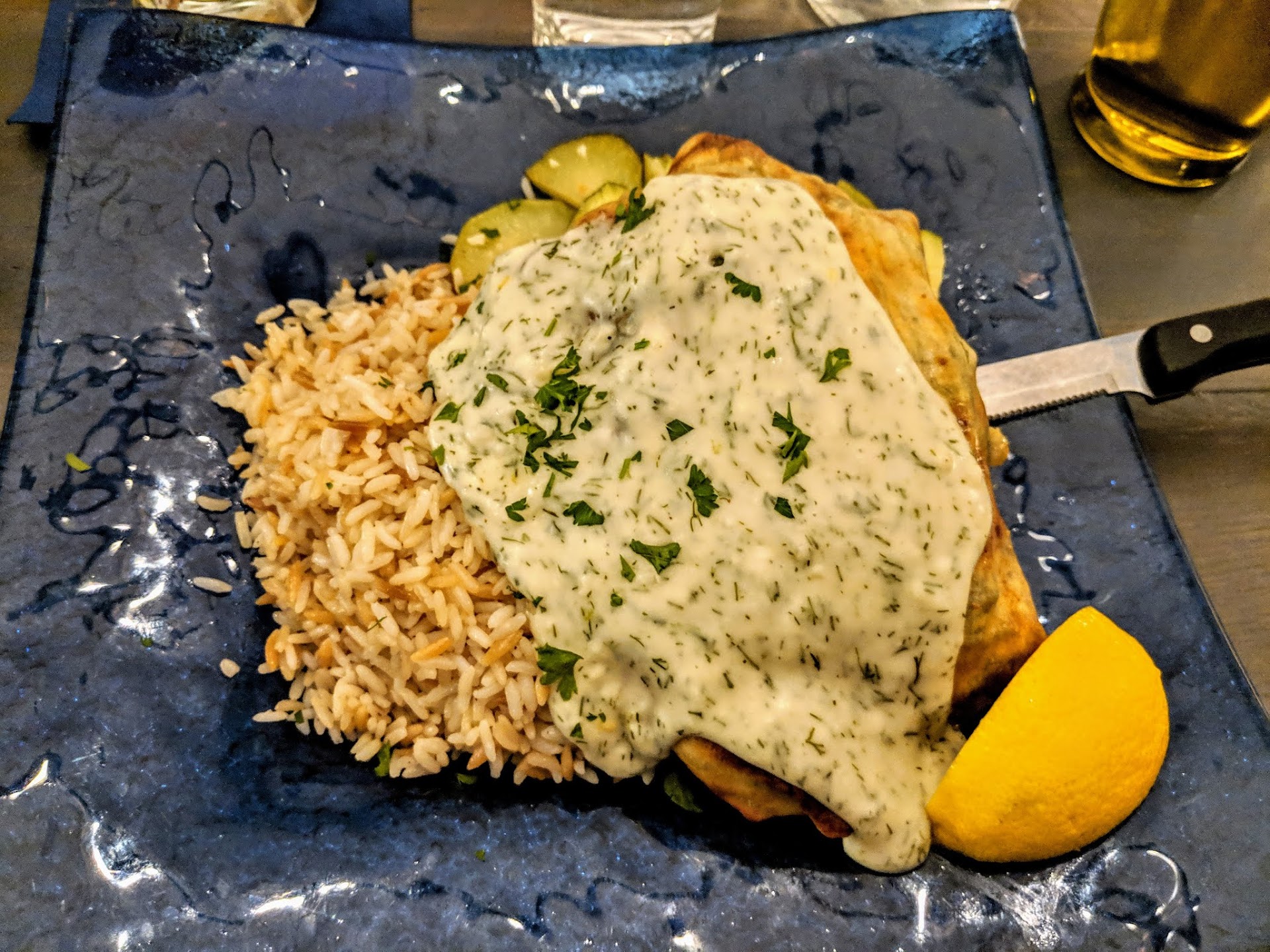 My neighbors loved their salmon; one gentleman raved about his white sauce pizza; another said her vegetarian lentil soup was excellent. Another did not care for her mousaka, but had loved a prior meal there.