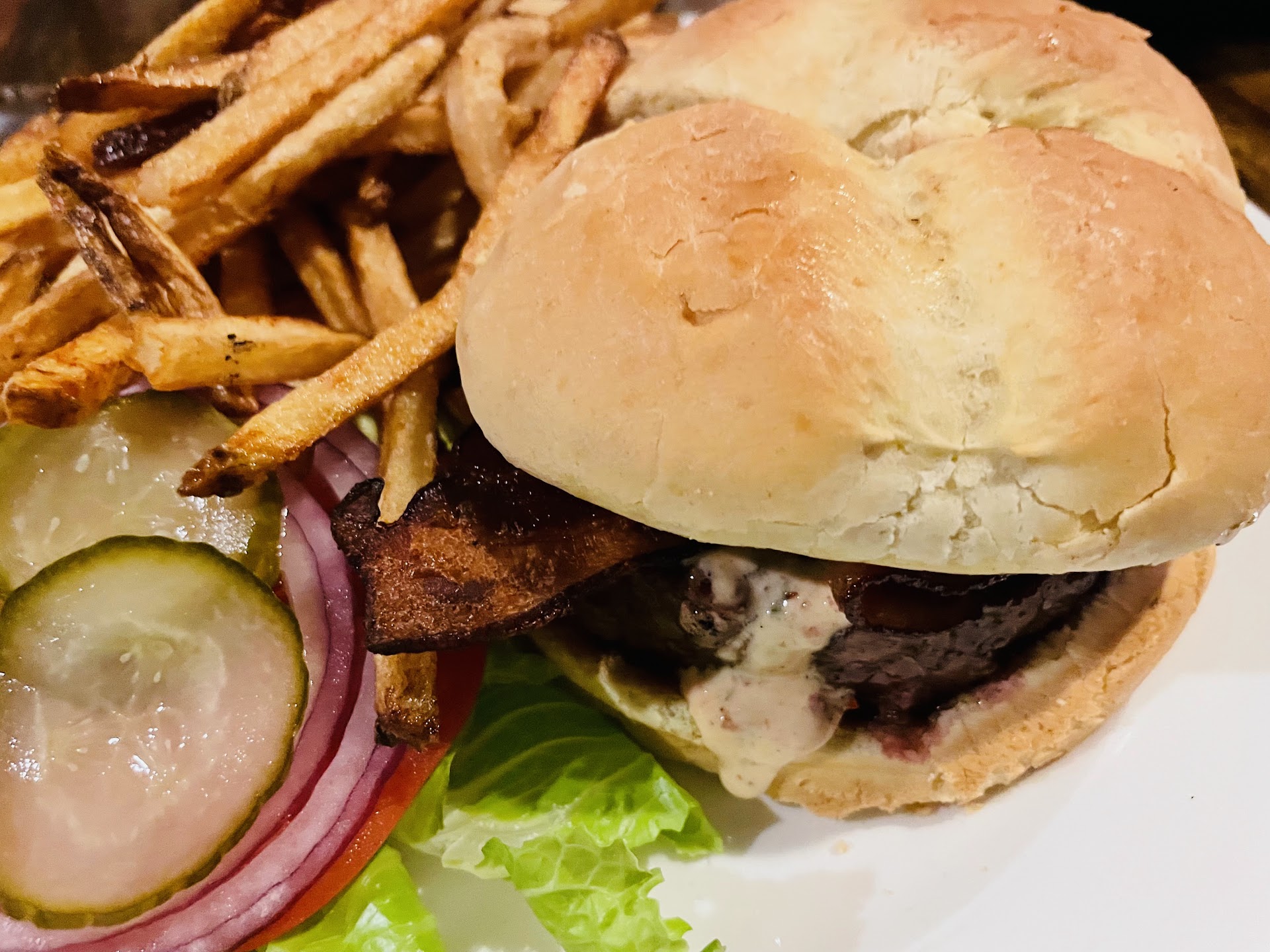 Read moreWould love to try the salmon next time. Good solid burger and fries that hit the craving spot. Very good beef. And the barbecue chicken and jalapeño pizza was unique and very yummy. Muscles & dipping were also very delicious. We were a large group and got the muscles to share. Only thing I wouldn’t order again is the raspberry non alcoholic drink because that was a little too sweet. Also we were seated in a nook area and I’d love for the lighting to be improved. But for a casual family place and for what’s in the area a good place with a good decent menu. Like I said I’ll probably try the salmon next time. I saw another table get that and it look very good and well...