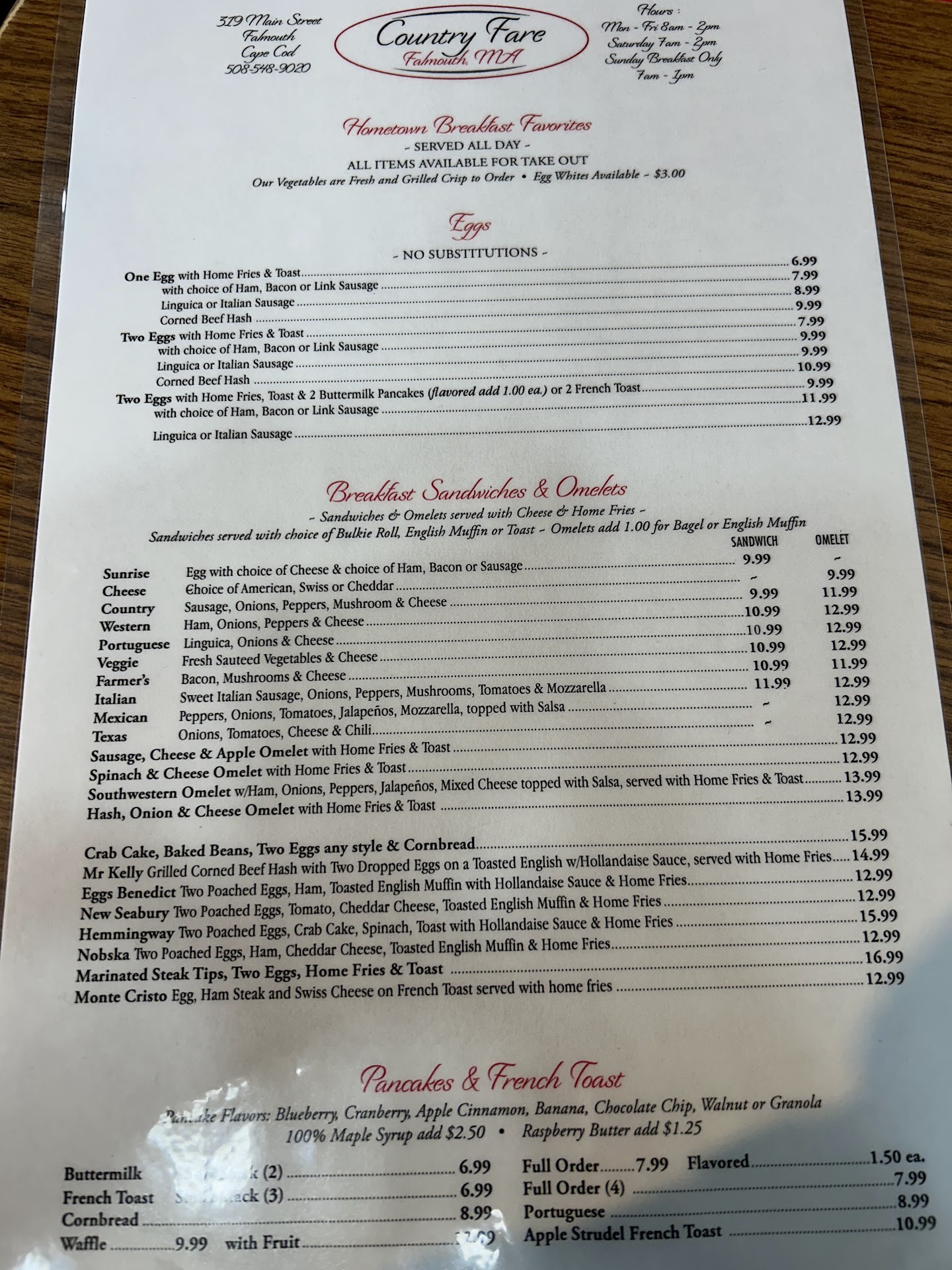 Read moreWe've been visiting Falmouth every August for just about 20 years. We always make sure to have at least one breakfast and/or lunch (it usually ends up being more) at Country Fare during our week here. Service is usually quick & food is always yummy. This past August was rough due to staffing & supply shortages. Went in for lunch one day (as a party of 6), and there were only 2 servers, 1 cook, and the boss. But our server (Tammy?) hustled her a$$ off and kept a positive attitude throughout. Food didn't suffer one bit either! This October we were fortunate to return again. Happy to see more staff, and the food was quick & tasty. We love seeing the servers who have been here for years- gives us a sense of "coming home", even if we're only brief annual visitors. Kudos to the staff (the ❤ of Country Fare, IMO) for all their hard work & great service! Hope management recognizes how valuable their employees are and treats them accordingly. All the best for many more years of success as a Falmouth culinary...