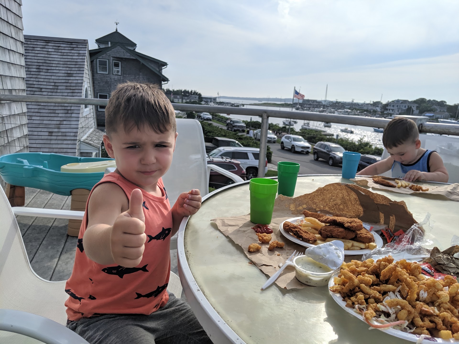 We went and grabbed our order and on the way out someone from the kitchen yelled "hey, hold on a sec". A few seconds later he walked out of the kitchen w a few french fries on a plate. He told my son "follow me". We walked around the corner and dropped a fry or two into the water. A few decent sized bass came up and started picking off the fries. It was awesome. My 3 yr old was beyond pumped. He then dropped a few fries and watched the bass come up and inhale them. Made my son's day!