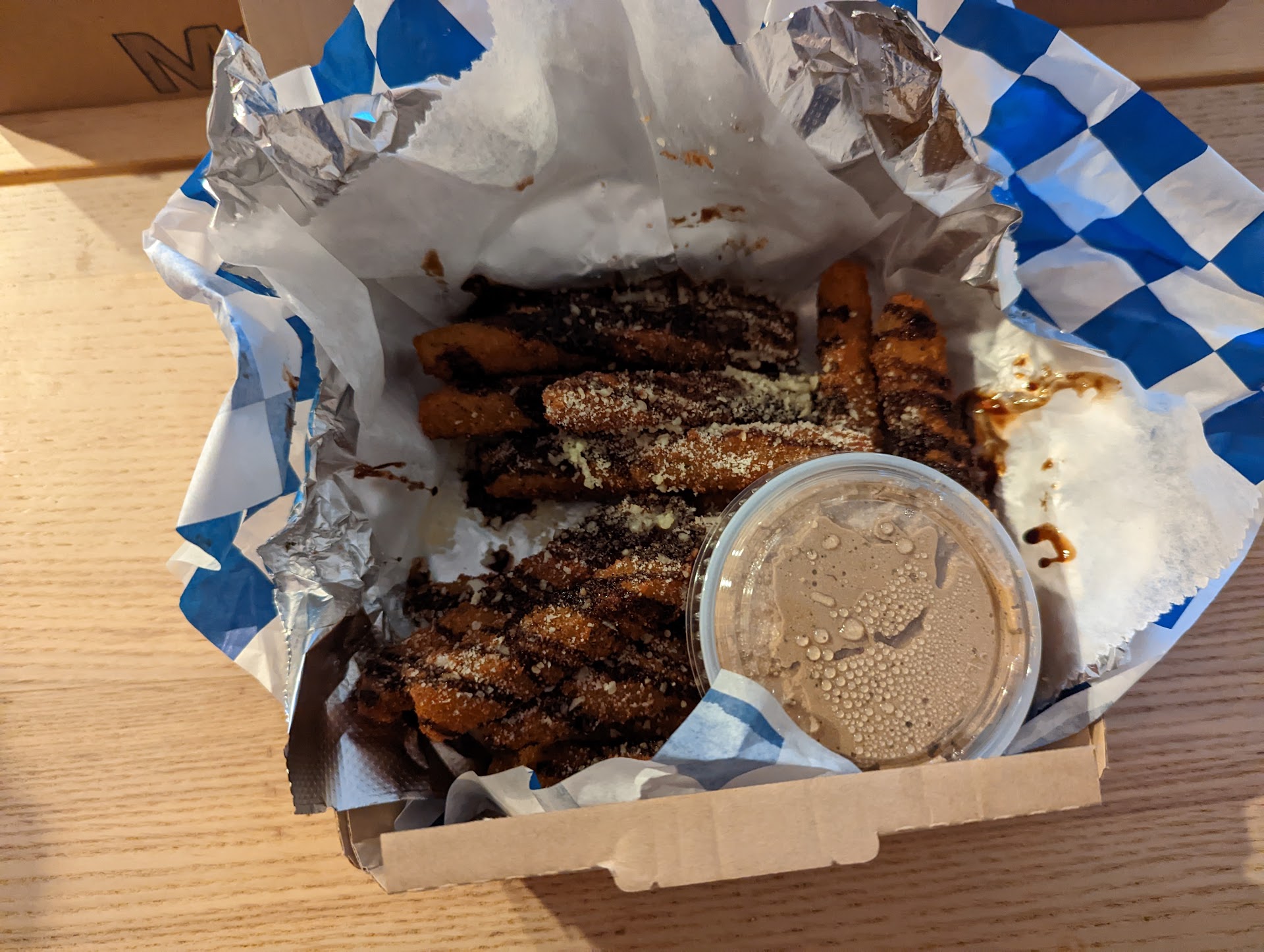 Second visit: The Chocolate Chip Gellato was amazing! The pizza: Fig and Prosciutto. Again Same problem extremely doughy and undercooked. There was a pool of liquid under the cheese. Finished a slice. Gave the rest away.