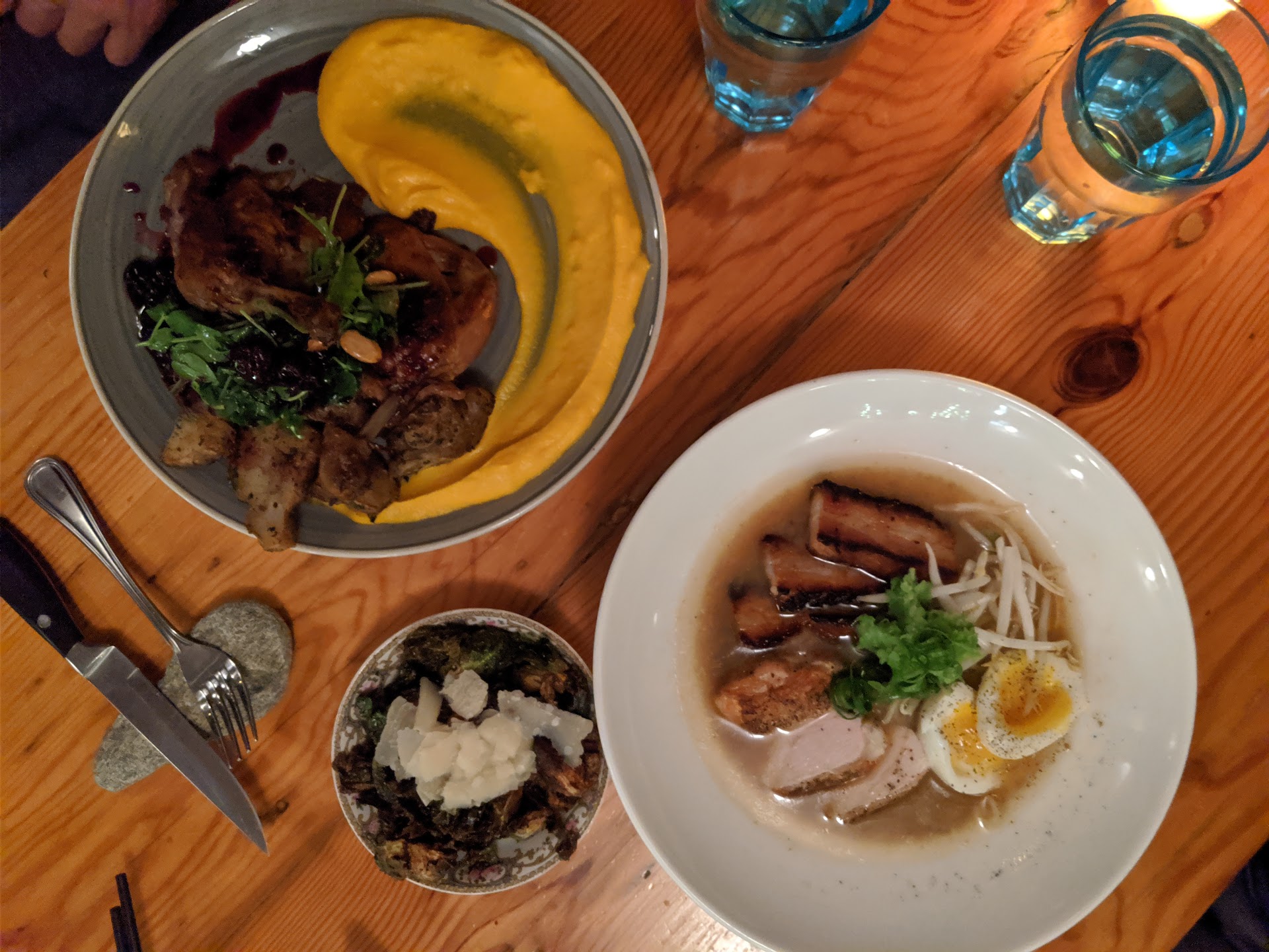 For mains my partner had the shoyu ramen and I went with the duck confit. Portions for both were generous (I went home with 1 of 2 duck legs on my plate), so not quite sure what some of the other reviewers were talking about; perhaps the chef listened to feedback? My partner was not a fan of the broth, but I thought it's complexity was excellent; light but rich, if even possible. The home-made noodles were, for me, absolutely disappointing, as they had zero bite in them, to the point of being airy. Ramen noodles exist in numerous varieties, and like whisky, there's not so much a right or wrong as much as what you prefer, so YMMV. The protein in the ramen was perfect, I'm guessing the chicken breast was sous vide before being crisped. My duck confit was brilliant, from the potatoes to the meat, everything tasted immaculate. We also had brussel sprouts on the side, which was pretty good if not a little too acidic.