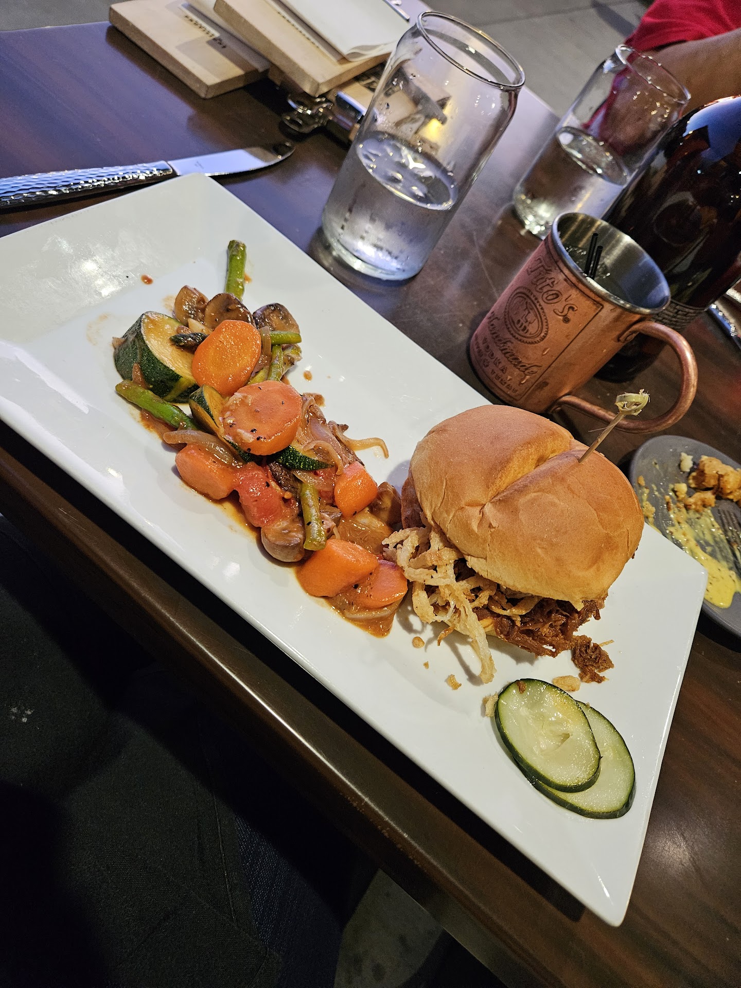 The food was disappointing and the sautéed veggies are lightly sautéed and smothered in some salty gravy. The fried cauliflower with honey mustard is pretty good, we all liked that the cauliflower wasn't mushy. The risotto was very very bland and was missing something - idk, put dried cranberries in it or something if it's meant to be vegetarian, and a lot more than 1 asparagus sliced into fours.