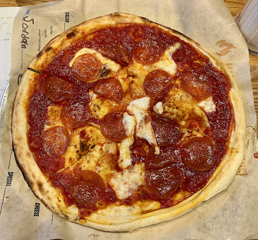 The bake: they had a large"blazing hot" pizza oven. It worked. The guy tending knew what he was doing. He shuffled the pizzas skillfully leaving my za evenly baked, crisp, and cooked thoroughly.