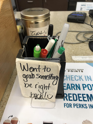 Read moreCaribou inside a south Fargo grocery store. Been at least twice. Fist time there were 2-3 young girl employees working. It was late in day and they let me stand at the ordering area not telling me they just closed until I asked. Second visit was right after lunch rush. One lady in front of me. 2 employees. Gal behind counter was working (albeit super slowly) helping the first customer while I waited. Employee 2 was doing 'inventory' of products in front of and behind the counter...while I waited...and while #1 ran off to restaurant/cafe area to turn off popcorn alarm and reset. While I waited, I had plenty of time to notice ALL the dusty/dirty areas (see photos).😳 No napkins in the dusty dispenser and some of the 'for sale' coffee tumblers in front(which was just inventoried, thank goodness) were dirty. Lots of other Caribou options in town that I will from now on...