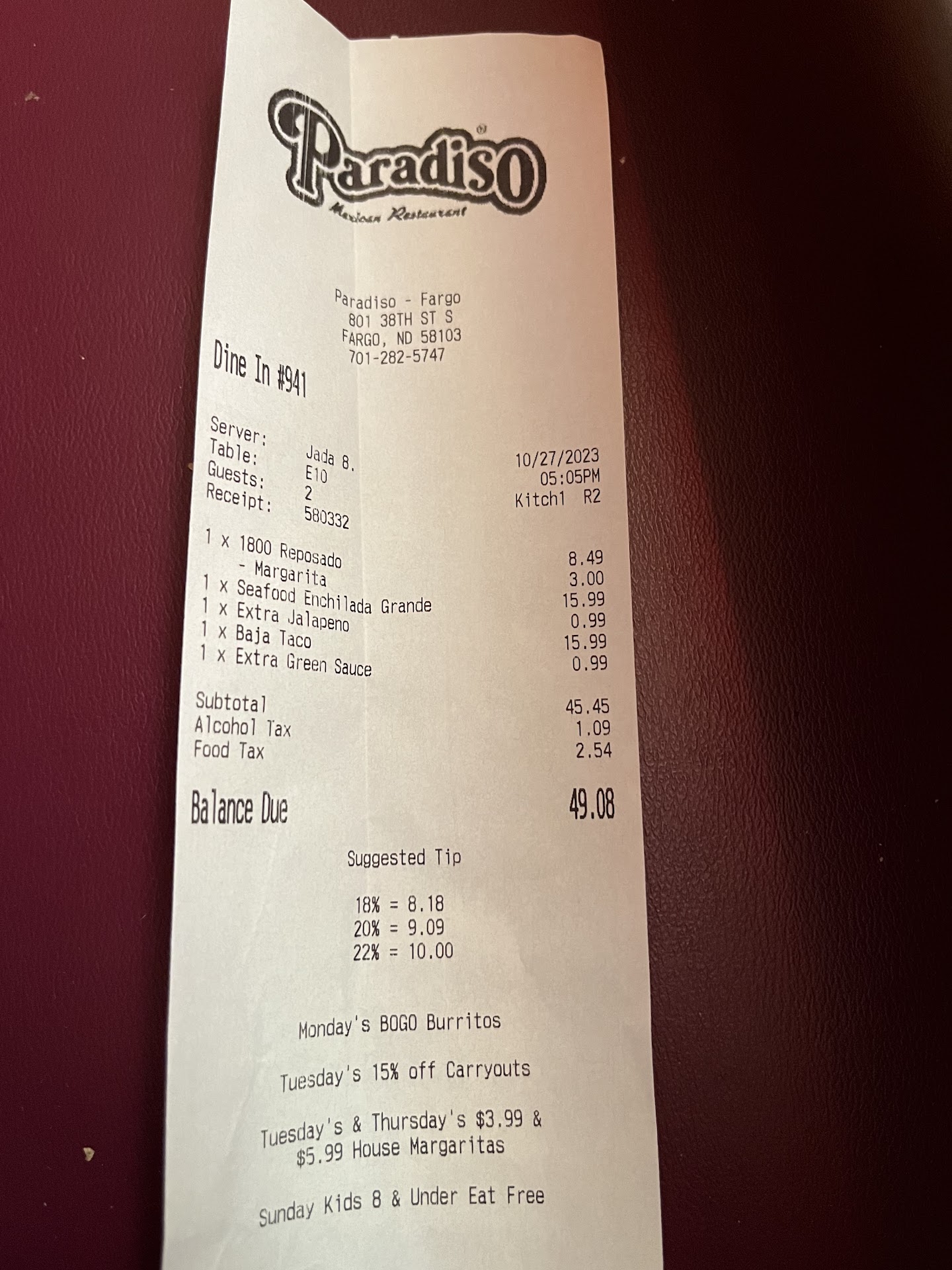 Read moreWork brings me to Fargo from the twin cities once a week, as I do not like eating at fast food places I choose a different place to go to after my work day. I'm responding to your question of how my dining experience was, unfortunately it is not good news. To begin with I waited at the front hostess area for about 5 minutes before someone came out to seat me she did ask me whether I wanted a booth or a table, there was a booth available but she had to clean it, which she did immediately but unfortunately for some reason, like many wait staff does, when she wiped it down there was left wet, I asked her if it was possible for her to dry it off which she did and was very courteous about it. Never have understood the practice of wiping down a table with a wet towel and leaving it wet so are you can put your hands, keys, checkbook, or whatever you have including the menu on a wet table. When asking the wait staff if there were any specials or anything featured from the menu he pointed to the fajitas. I asked him what the price was he pointed and said it was the price on the menu.,... Neglecting to mention that it was an all-you-can-eat special on Wednesdays. The only way I knew about it was by hearing somebody else at the next table talk about the special. When my food arrives I had no silverware since this was my first time at the restaurant I was unaware that the silverware was in the advertising box on the table. The food itself has little if any to be desired, nondescript or bland at best. To end my dining experience I had to go to three different people to try and pay my bill, it was $17 and some change I left 20 on the bar not because I thought anybody deserved a tip but I was more than done with my time at your establishment. The waiter was pleasant enough it's just that I think he had not been trained properly on customer service. Summarizing I definitely do not have glowing positive review of my dining experience at your place, hopefully something positive can come out of...