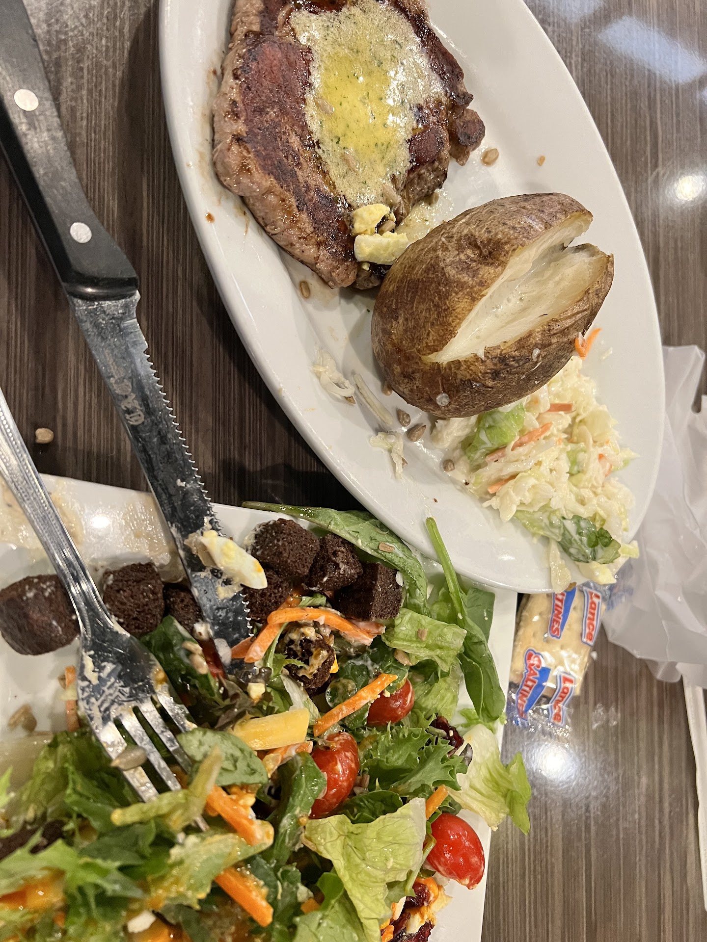 Ā Ā Ā Read moreMy friend and i went for girls day out and decided on the two for $50 meal deal. It took us a while to decide but we had a young woman with beautiful red hair waiting on us and she was patient and friendly and didnt get frustrated. I cant eat much at a time but had been craving salad bar there for months. I took one plate and didnt get another for the various prepred salads, just a lettuce one with the toppings. I knew i couldnt finish even that or the food i ordered on the deal, but it was part of the meal. I noticed on the salad bar it now said if you want a to go box for what u didnt finish, you had to pay full price for it. I didnt have a large salad so thought that was a bit excessive. Our meals came and my 6oz steak was grey, like it was microwaved and mostly fat. The waitress was very nice about taking it back. My friend loved her chicken and mashed potatoes, and our dessert. My second steak came and was identical to the first, like they just reheated it. There was no meat, only fat, and it was still a sad grey looking tiny meat. I just gave up and asked for a to go box for it and the steak i said id just give the dogs. Our waitress was wonderful through the whole thing so i gave her a great tip for putting up with the hassle. I should have just asked for a togo salad bar in the first place. When i got home i weighed the steak with all the fat and what little amount of meat it had. That thin grey piece of meat wasnt even 6oz with the fat and less than one ounce of edible meat without the fat. I 100% recommend our waitress, still love the salad bar but should have paid full price so i could try a little of everything and taken the leftovers. My friend loved her meal and the cake. That steak is why i gave it 4 stars. It was the tiniest, fattiest, sickly looking grey piece of steak id seen in my life and not even the weight it should have been unless you like all fat no meat. Ill just get togo salad bar and not waste all that money. The waitress was top notch, the meal not...