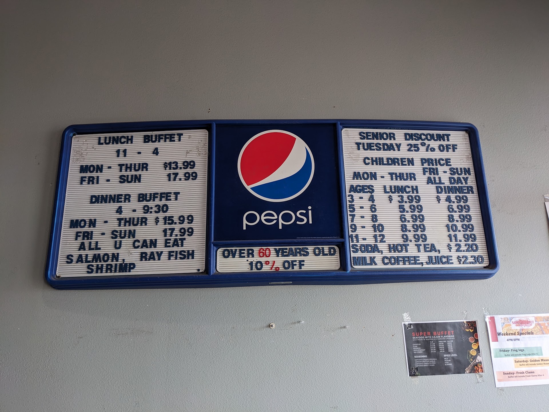 Ā Ā Ā Read moreThe true test of a good buffet restaurant will be how fresh the food is about an hour to an hour and a half from close. We arrived approximately an hour from close. The greeter asks... "you can finish in 45 minutes right?" Secretly I was giving this man a middle finger, but we brushed it off and sat down. It wasnt busy - just a few tables. I started off with the "spicy potatoes" and some craw fish. The spicy potatoes were absolutely the worst thing I've ever had in any restaurant all of my life. Not fit for human consumption whatsoever. The craw fish were lukewarm and unimpressive. I then had some hot and sour soup. The okra they put in it ruined the taste for me.. It didn't taste like hot and sour soup, it tasted like okra soup. I then had some angel hair Asian noodles with peanut chicken and butter chicken. The noodles were not fresh, and crusty on the edges - translation... Sitting out for hours. The chicken was alright but cooked very long ago. I'll spare you the rest of the details but it was simply not fresh food. They had given up on it long ago. We complained to the anemic looking gentleman when we left and his excuse was "well, it is close to closing time". Hey pal, don't feed people this garbage. You're going to get someone sick. Absolutely horrible buffet and I urge people not to eat here, especially near...