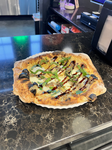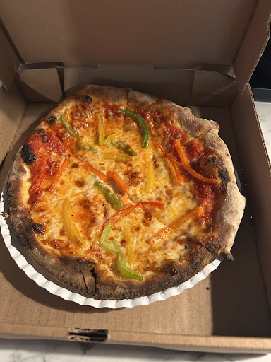 Good pizza; unique setup. This pizza shop is set up in a community vendor area. There are a few bar height benches you can sit at or there are picnic tables for everyone to sit at that is in the building. They make you give them your phone number so they can text you when your pizza is ready. Is that really necessary? Hoping I don’t start getting messages from them. The guy who took my order was very nice. As I sat and waited for my pizza, I noticed he would take orders and then go back and help make the pizzas. No gloves or washing of hands. He didn’t take cash from anyone but it would have made me feel better if he put on some gloves before touching my pizza toppings.