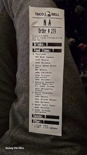 Ā Ā Ā Read moreEVERY TIME I ORDER FROM THIS TACO BELL I AM MISSING AT LEAST 1 or more items depends on what is ordered!! The nacho Doritos loco taco was smash & broken in to pieces , barley any chicken ( was subbed ) & ordered 2 Beef Chalupaās only got 1 ( $7 each btw ) - did call the store & did receive the 2nd Chalupa but under a attitude! If we pay for something we expect it to be correct the first time. Btw Iām not usually the one to leave reviews! Something...