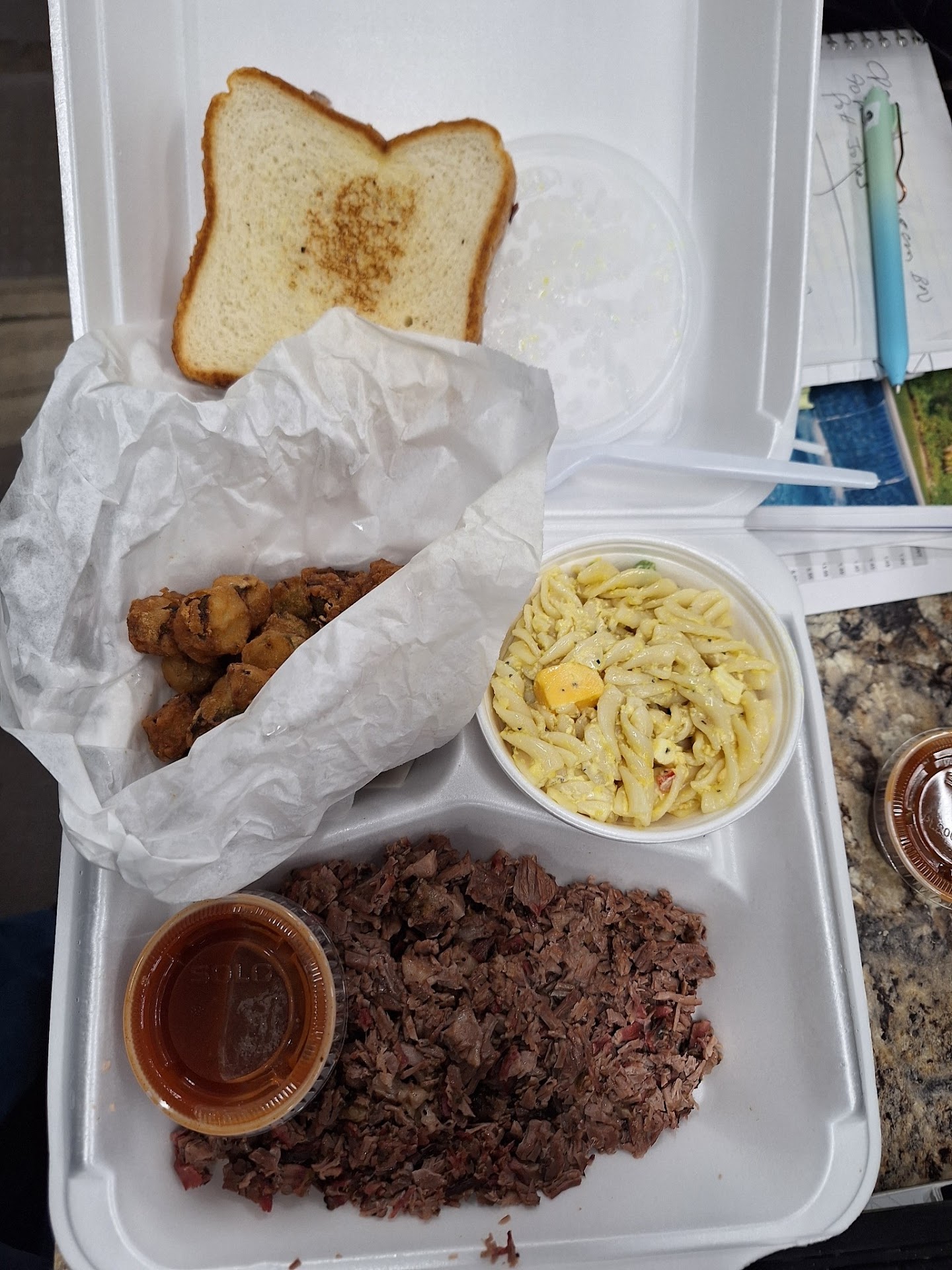 There was no line at 2:00pm, so I was instantly served. I typically reserve judgement on any BBQ establishment until I've had their brisket and BBQ sauce at a minimum. So, I ordered a brisket plate and had a side of Mac n' cheese, fried okra and their house BBQ sauce on the side. Everything looked tasty...