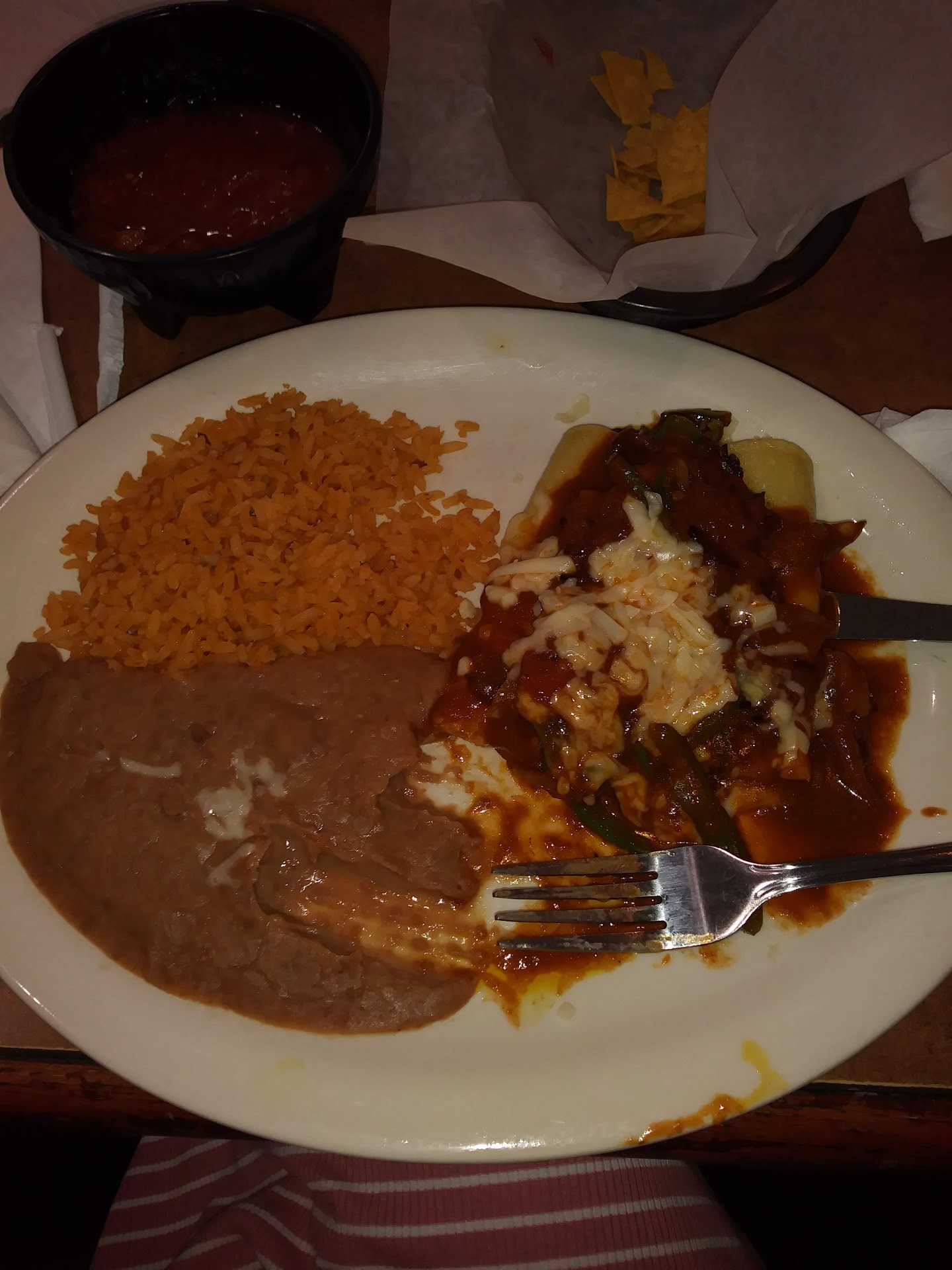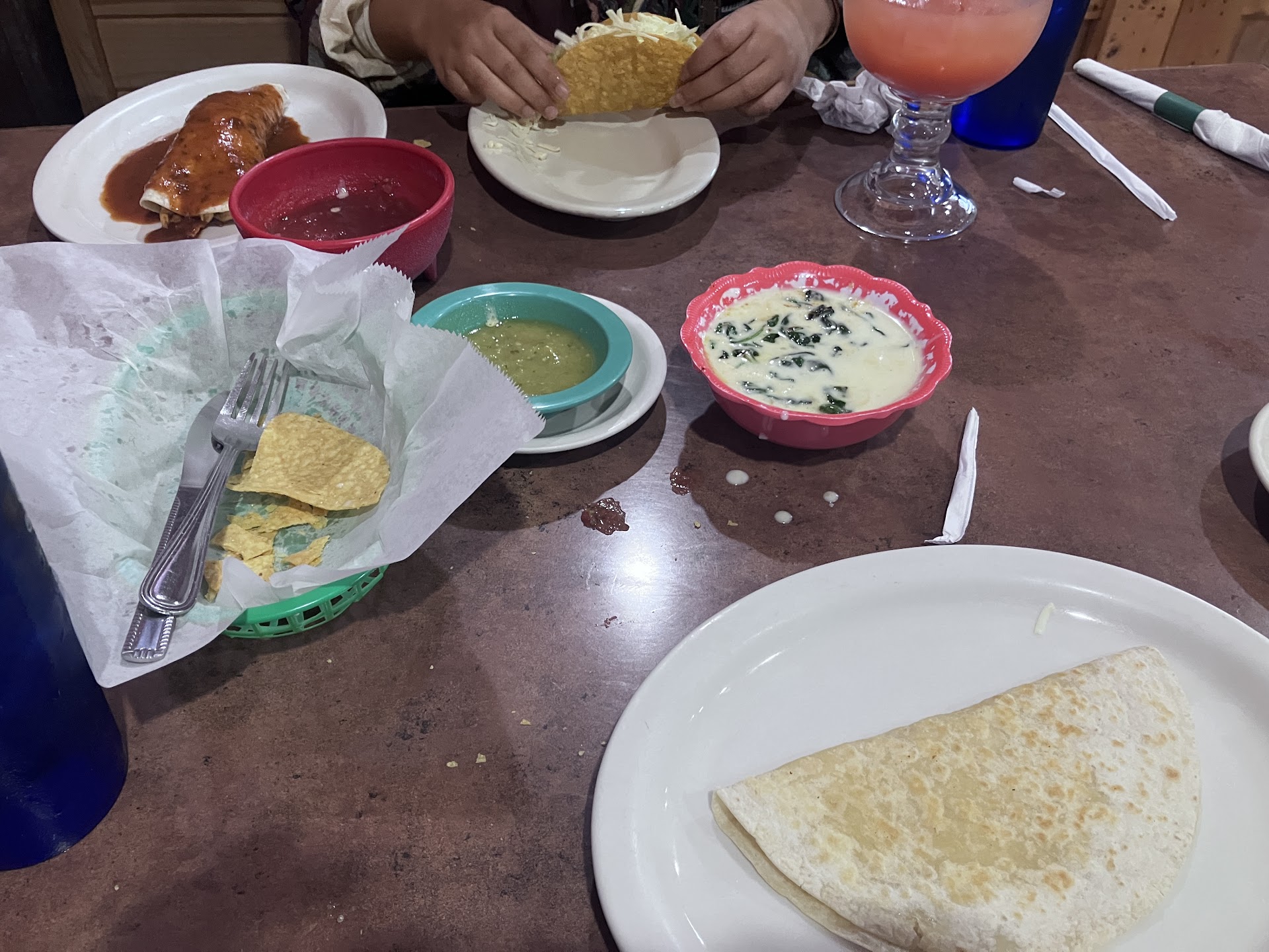 The service was excellent. The food was decent. We were greeted with the warm chips and salsa. As soon as we came to the restaurant it was really nice. The server regularly checked on us, asking us whether we needed anything else or not. Salsa could be a little more fresher. The spinach dip that we got was nice, it is a little more saucy than what we thought on the other hand. The quesadilla was decent. It was not the best quesadilla I’ve ever had or the worst queso I’ve ever had so I would give the food a decent ranking. The restrooms were clean as well. What A particularly liked about the restaurant was the server regularly came and asked what we needed. The drink was really nice. It was the special drink that they have which is...