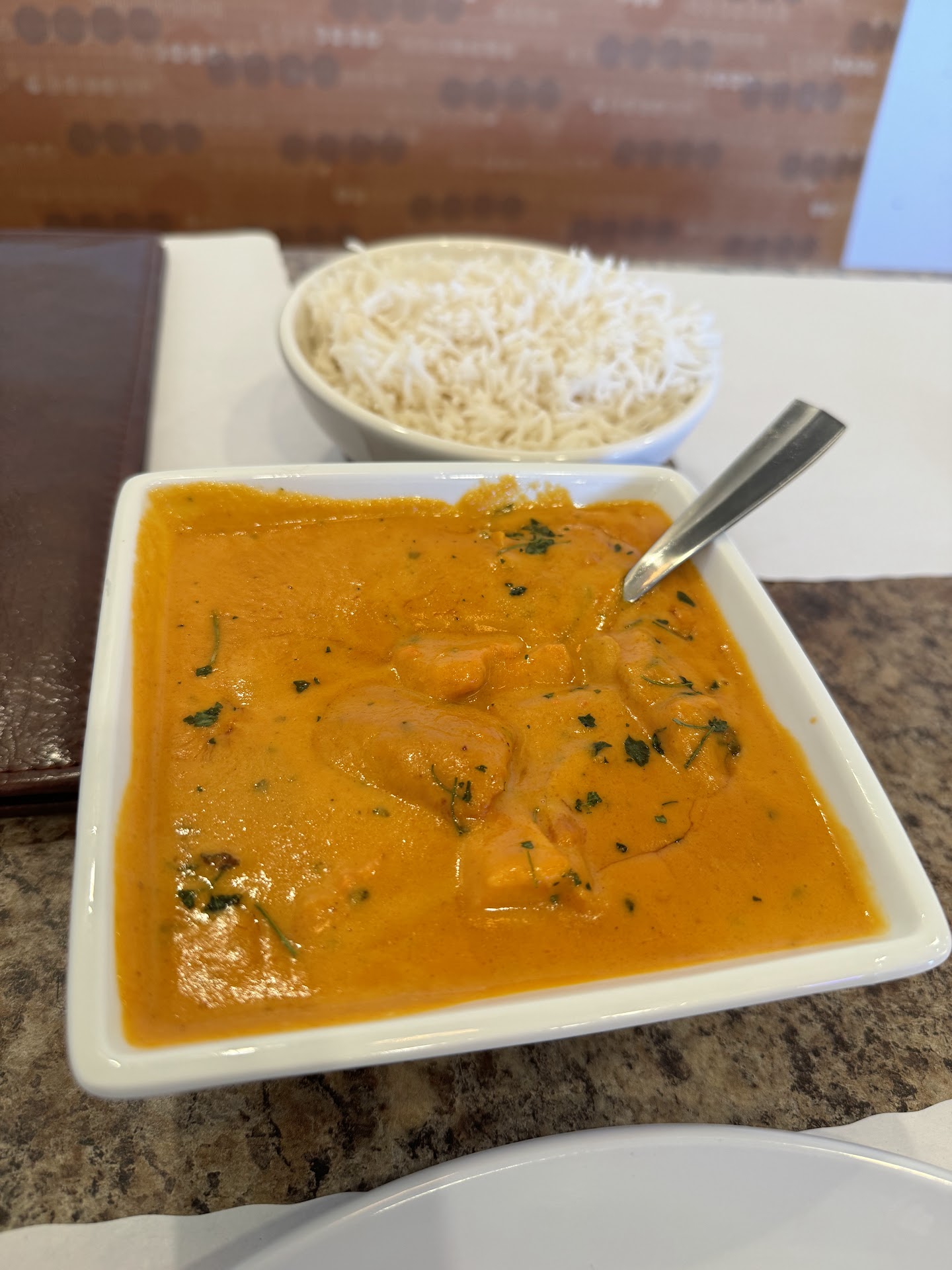 Read moreI came here solo for lunch on a weekday and was the only person in the restaurant. The host (a young man) was also the server and let me know they opened a week or so ago. He handed me the menu and then waited next to my booth while I ordered. I ordered the garlic nan and chicken tikka masala. He said the mango lasso was very good, so I ordered that as well. The server decided to hang around my table talking to me the entire time I was waiting for my food. I was trying to get some work done on my phone, but he wasn’t picking up on my social cues. Finally my food came out and he stood there staring at me while I ate it. He didn’t speak, but wouldn’t leave. There was so much awkward silence and staring and I’m not a fan of people just watching me eat. FINALLY, a couple walked in and he was paying attention to them. But after about a half hour of uninvited staring and awkward conversation, I hurried to eat so he wouldn’t come back over. As far as the food goes, it was really really good. The ingredients were all so fresh and all the spices harmonized. The awkward waiter was not wrong, the mango lassi was delicious and I’m glad I got it. I would have probably ordered more food had I not been so turned off by the situation. I will absolutely order for DoorDash or pick up and send my...