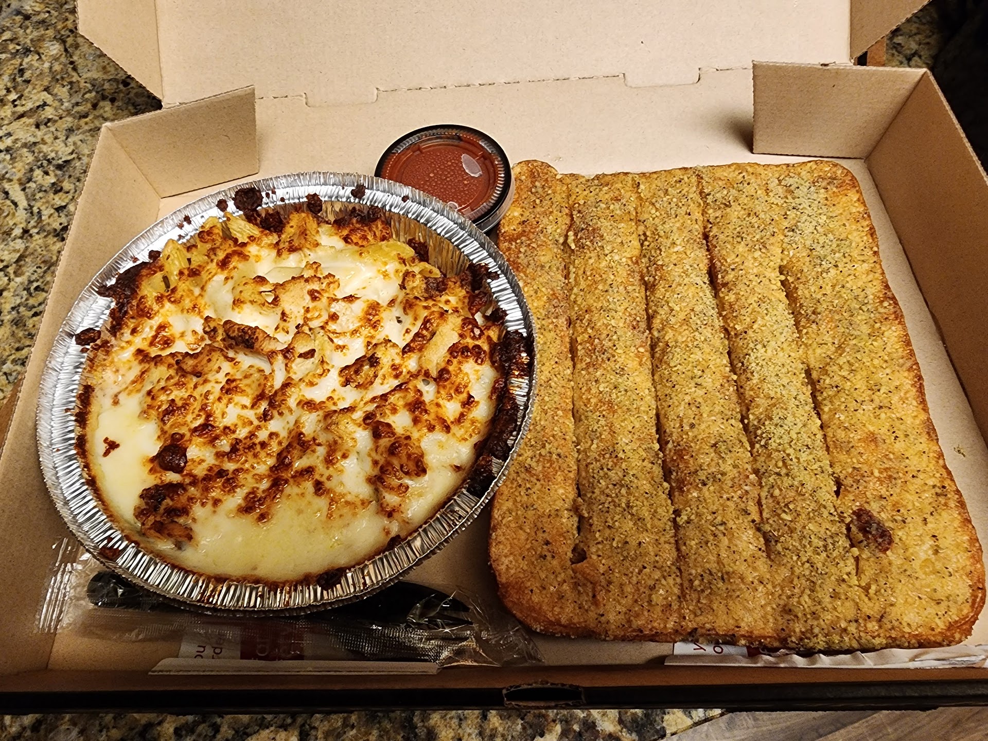 Just take a look at my pizza. It looks like very poorly made and almost old looking and weirdly offset. I ordered parmesan garlic wings, and the sauce was thick with way too much garlicy taste and get this, NO RANCH. I also ordered their pasta, and it was watery. Definitely need some new folks to come work here because clearly the staff doesn't care how this food...