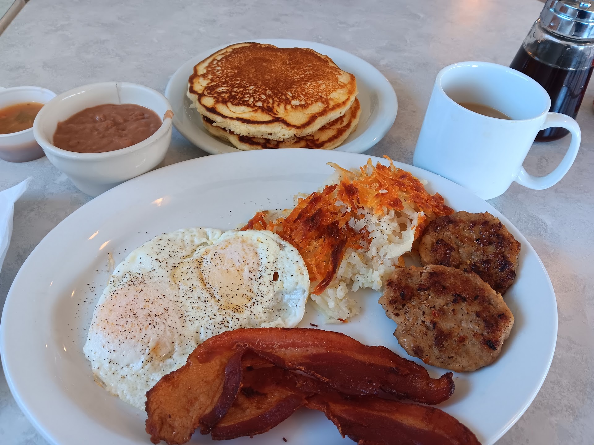 So I wanted to go see the hype about this place, and OMG, this place is a 5 star breakfast. My pancakes had a krispy to it. And it was soft and moist in the middle, just the way I like it. Also, my bacon was crispy the way. I like my bacon, too. And my hash. Browns also had a crunch and soft in the middle superdelicious. If you never stop by here, you need to check it out. These ladies here were very nice and kind. I want to thank you all for a great experience. I will be back...
