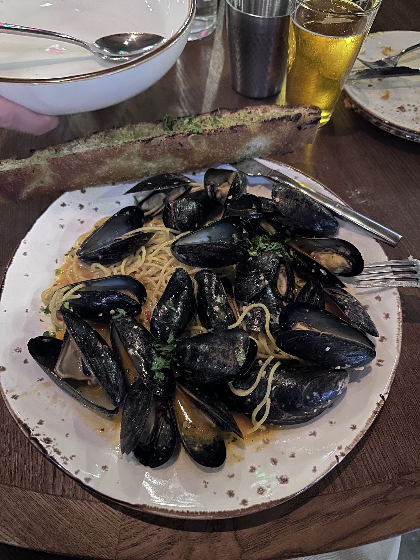 The food was good. We started out with the artichoke. It was great I love artichoke dip and as long as the artichoke and spinach isn’t chopped to oblivion, I’m happy. I really enjoyed the lumps of artichoke and the spinich ratio. Perfect medley. Next we got the house focaccia and grilled garlic bread. The house focaccia was fantastic that was great bread and butter. Would eat again several more times. The garlic bread had the butter lovers dream of butter, my friend said just a little too much but not terrible. I don’t have a gallbladder, but it was worth the flavor. Did taste Smokey so it appears it was cooked in a wood oven maybe? The three that got the bolognese said it was good. But not much more. My spouse got the “substitute pizza”. Some items were not available for the all cheese pizza. The crust was just a bit too thin and it was more of like a fondue with a pizza crust. Great flavor either way, just a cheese lovers dream. My mussels spaghetti was fun. I really enjoyed having the mussels and pulling them out myself. I love garlic and would have enjoyed just a hint bit more. The sauce was a little thin but I am going to assume that the mussels were cooked in water and when transferred had brought water with them. Not a deal breaker but I’m cool with that. It’s seafood. My friend got something with Pesto? She said it was tasty, it looked good, had pasta and maybe cucumber in it. I didn’t do the greatest job at asking her what she had. I would not bring my kids or teenagers here after a day of shopping, because they wouldn’t appreciate the food being served. Over all I still give the food and location a 3 star. We still had an enjoyable evening staff was great. Our waiter was great. Just wanted to leave an honest review and the reader can take it for what it’s worth. The owners have a great concept but I think maybe there needs to be a lighter airier atmosphere and not so “romantic” and maybe adjust the dinner prices. To heavy of meals for...