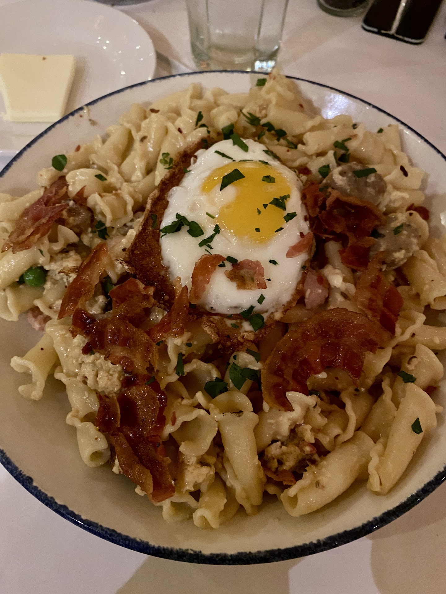 I ordered the Sausage Carbonara, which the menu highlights as a âguest favorite.â Based on the description, I already knew it wouldnât be authentic, but I wasnât prepared for just how far off the mark it would be. What I received could maybe pass as some sort of âbreakfast pasta.â Instead of a silky sauce, there were chunks of scrambled egg, topped with a sunny-side-up egg that the whites were overcooked and tough. The pancetta was barely there, and in its place were broken strips of regular bacon. The only identifiable flavor came from red pepper flakes, which made the dish unnecessarily spicy but did nothing to save it.