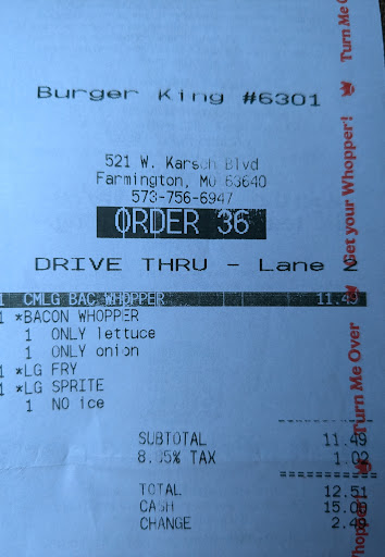Read moreBurger King #6301 in Farmington, MO is the worst Burger King i have ever been too. First thing in the place has an overall look of unclean, when I'm standing there waiting to order and i over hear a cook and someone else talking about getting sick, the cook asked the other person if they just got sick, he proceeded to tell the cook "Yea i just did". We we're deciding what we were going to have and the girl at the counter just walks away, finally some other man walked over and took our order. I asked if there was a triple, the guy just pushes the button for the triple never asked if i wanted just the burger or if i wanted the meal, then it took every bit of 15mins to get our food. The ketchup dispenser was out, had to ask for ketchup so they proceed to turn around and get ketchup packets out of a box in the floor.