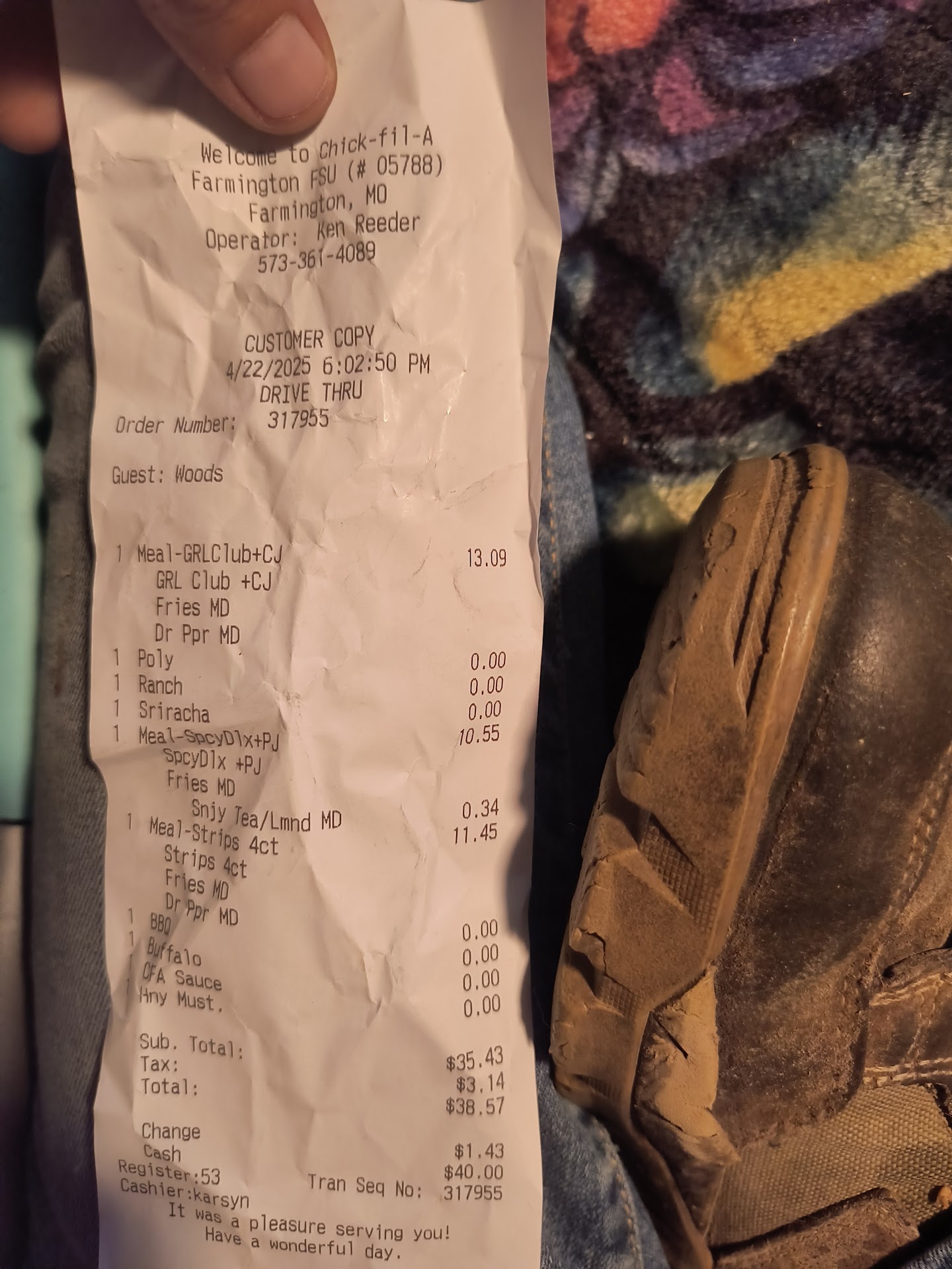 My wife and I decided to try the new CFA this evening, Friday 2/21/2025 @ 6:45pm. What a sad, sad disappointment. Jordan the cashier was pleasant, but it went downhill from there. We sat waiting in the uncomfortably cool dining room, (because they had the door to the drive through propped open. Every person in the dining room had their coats ON, btw).Not the smartest thing to do when it's 19° out, waiting for our food, which never arrived. After 10 minutes, I decided to go back to the front counter to see what the issue was. The gentleman at the counter, I didn't get his name, but I assumed he was a manager, dressed in a black pullover type sweater, and about 50lbs overweight with glasses. Looked at my receipt, apparently saw no issue with it taking 10+ minutes to get my order. Looking behind the counter, I could see my wifes salad sitting on a tray off to the side, like our order was completely forgotten, (which it obviously was). He placed my sandwich, (with the stale, crumbly bun) and fries on the tray, handed it off to another employee , and walked away. No apologies, nothing. Apparently, CFA corporate has lowered the standards to whom they award a CFA franchise to if this is norm. Truett Cathy would not be impressed. Neither was I. We...