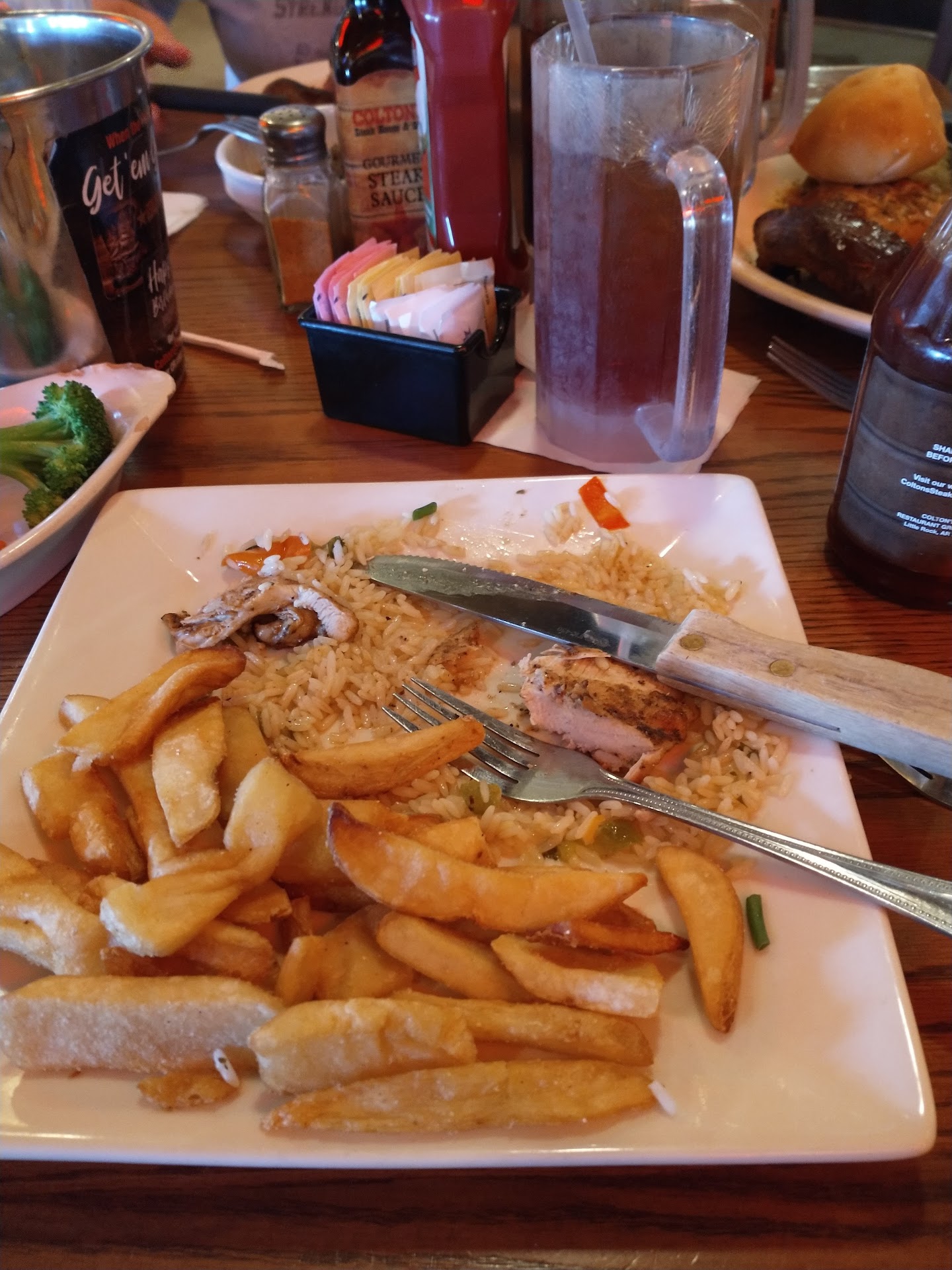 I visited a few Sundays ago and usually have a wonderful experience at Colton's. This visit, not so much. Service appears to have gone downhill. I had inquired about a specific table and they said they would check on it. They said they could seat us there but when they took us over, we were sat at one table back which may have been where the confusion started. We sat for 10 minutes as server after server walked past our table and never took any orders. My husband finally went up to the host desk and told her that no one had ever come back to our table. She seemed surprised and said she would look into it immediately. A couple minutes later, a server was walking by and stopped and asked if we had been taken care of yet. I said "no" and he asked if we knew what we wanted. We told him we were ready to order. We finally got to order our drinks, appetizer, and entrees. Our salads came out and I had to pick quite a bit of lettuce out as it had a lot of brown on it. We finished our salads and continued to wait. The appetizer came out about 20 to 25 minutes after we ordered it. We finished our appetizer and continued to wait even longer for our entrees. Our server walked by and asked if we were ready for dessert. My husband informed him that we didn't even get our steaks yet. Our server thought that someone else had already brought them out. About an hour after ordering our entrees, they finally came out. I don't know how long they had been sitting in the kitchen but both the butter and sour cream in our potatoes were just puddles at this point. Our steaks were lukewarm. I don't know how they sat in the kitchen that long without someone noticing that they were just sitting there. I love Colton's filet mignon so I won't completely give up on them but it's going to be a while before I return. I'd like to think that it was due to being short staffed but it seemed as if most of the staff was gathered around the bathroom giggling and watching another staff member clean up whatever had happened in there. I also really wish they'd stop sitting children and babies in the bar. It's really distracting if you're trying to watch a game and you have a baby screaming...