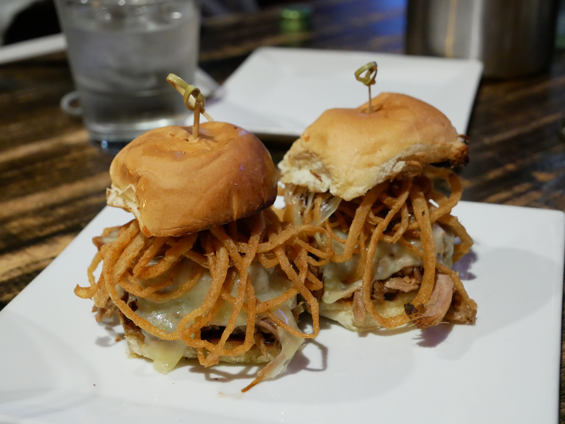 Pulled Pork Sliders: This is smoked barbecue pulled pork with fried onions, white cheddar cheese on a sweet Hawaiian roll. This was AMAZING. I did not expect what I tasted. The cheese was super gooey, the flavors were off the chain and powerful. The barbecue sauce wasn't super sweet and complemented the meaty, saltiness of the cheese with the pork.