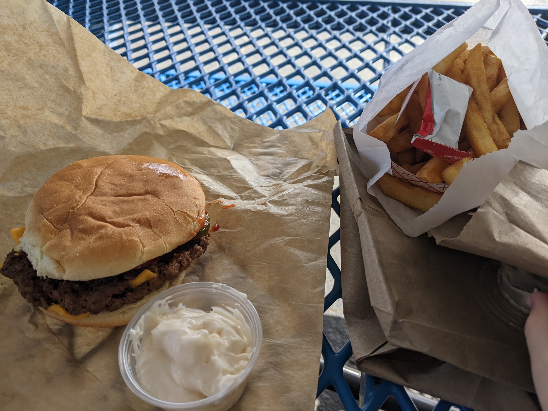 I'm leaving 4 stars instead of 5 due to the service we received. My family and I are there on a Saturday afternoon at about 4:00. Not particularly busy, but a steady flow of customers. It was a beautiful day out so we chose to get out of the car and eat at one of the picnic tables. My family of 4 placed our order of Hamburgers and fries, nothing out of the ordinary. We patiently waited for our food while other customers came and went. After about 10 minutes of waiting we, were noticing that vehicles that arrived and ordered their food After we had already ordered was getting their food and leaving. There was about 6 or 7 to come and go after we had already placed our orders. I finally had enough, after probably 20 minutes wait for burgers and fries I asked the waitress if our food was ready. She stated "Oh sure, yours is up next" and almost immediately brought it out. And you guessed it, cold food. One of my daughters had ordered cheese fries that were inedible due to the melted cheese hardening back up making a solidified chunk of cheese with fries embedded in it. The rest of the food was very good at a...