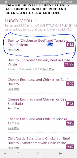 Read moreFantastic meal but some plates are a better value then others. Paying 1.99 extea for the Chile Verde gets almost as much Chile Verde as the Chile Verde plate so that's worth it. 1 corn tortilla given with the Chile Verde plate which was already extremely lackluster compared to the Enchilada plate and then they charged an extra dollar for a 2nd tortilla which seemed silly. The pricing just seemed off at that place. The chips and salsa was great but they had to refill it for us 5 times because the kept bringing us these tiny handfuls of chips (there was 4 of us). đ The booth seat was so old I could tell half of it needed to be replaced or repaired. The restaurant interior seems old, but doesn't give that nostalgia of old buildings it just seems old and slightly run-down looking but out of place. Menu seemed like it had too many options, mostly rearrangements or variations of the same sort of stuff. My advice: fine tune/trim the menu a bit to your best plates, do what you can with the atmosphere. Don't nickel & dime on tortillas when the plate is already costing over 15. I suspect the business is struggling. Having said all that, food was good enough that I would eat there again though. The pork/meats etc... very good. Better then just about every Mexican place...