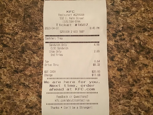 Read moreShout out to Mckalee! She was so sweet and nice! I was craving the Nashville tenders so bad! I went to the KFC by Toyota and asked for the Nashville tenders. The lady told me that they no longer had them and if I wanted them that she would have to charge me $3 extra to put the Nashville sauce on some chicken tenders. Ok that’s fine, then I asked for extra pickles with it and she told me there was absolutely no way possible she could give me any pickles AT ALL WITH IT! So I called up this KFC and Mckalee answered and assured me that she would not only give me the Nashville tenders but she would give me EXTRA PICKLES NO QUESTIONS ASKED! She saved my night 😊 thanks for the awesome service and tasty food!! (I hope I spelled...