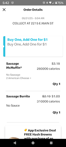 I am disappointed because my order is frequently wrong or missing items. Today I ordered two sausage McMuffins with no sausage and extra cheese, 1 hash brown, 1 sausage burrito, a side of scrambled eggs with a large coke no ice. For some reason I got no sausage burrito (thank you very much) and 3 hash browns. I didn't want 3 hash browns. I wanted my sausage burrito. I am not sure how someone can mistake 1 sausage burrito for 3 hash browns. It's not the same quantity or same spelling of word. I am not asking you to save the world, just get my order right. It's not the first time this has happened either but it's gonna be the last time. I can go to other places that serve breakfast, I didn't want to, but if you can't get a simple order right why should I continue to go e you my money. I couldn't come back and get it fixed as I placed the order through th McDonald's app and then went through the drive thru on my way to work so I don't have time to turn around and hold your hand to get my food order correct. Thanks for starting off my day great....not! I included a copy of my receipt and a picture of my order. As you can see what I got does not match what I ordered. The question is...why? Why would this possibly be so hard? I am very confused on the struggle...