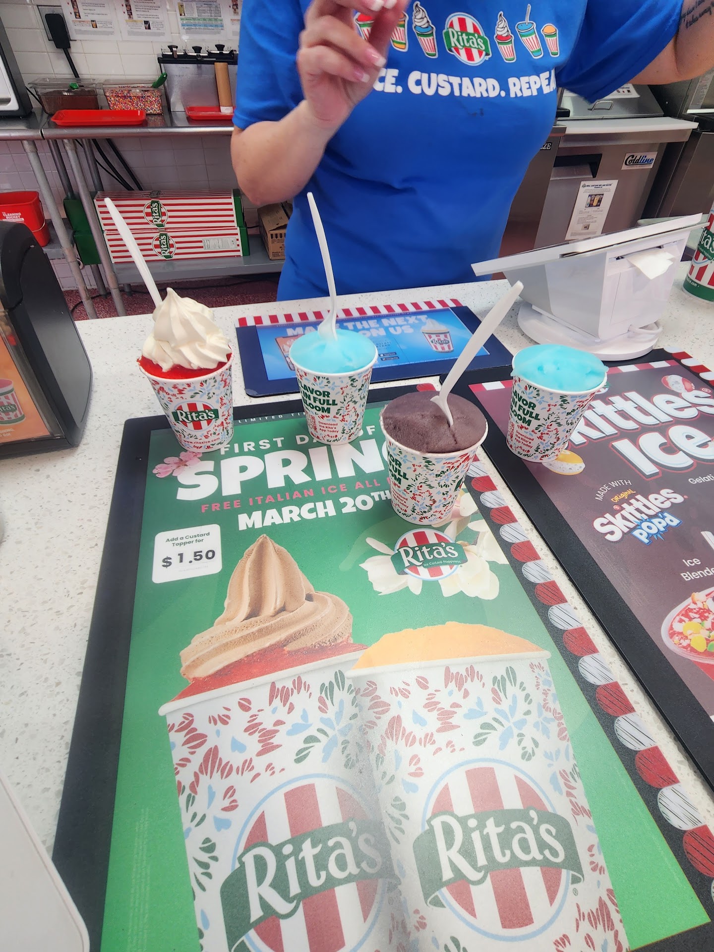 I had gone to a Rita's down South a long time ago but I didn't know we had one around here. Today seemed like a good day to try it. We each got something different and I don't really know what we got. Mine was pina colada and had creamy stuff swirled on top with ice underneath. Delish! My friend had something else, maybe a custard, and she wanted another one it was so good. The only bad part is the location on a busy highway with lots of noise and traffic. We sat outside and it was so noisy that we couldn't hear each other talk. There were seats farther back but they were taken so we had no choice. It's also hard to get into with your car--I missed it the first time and had to go back, wait for the traffic, and try again. Wish they had a different location but the eating...