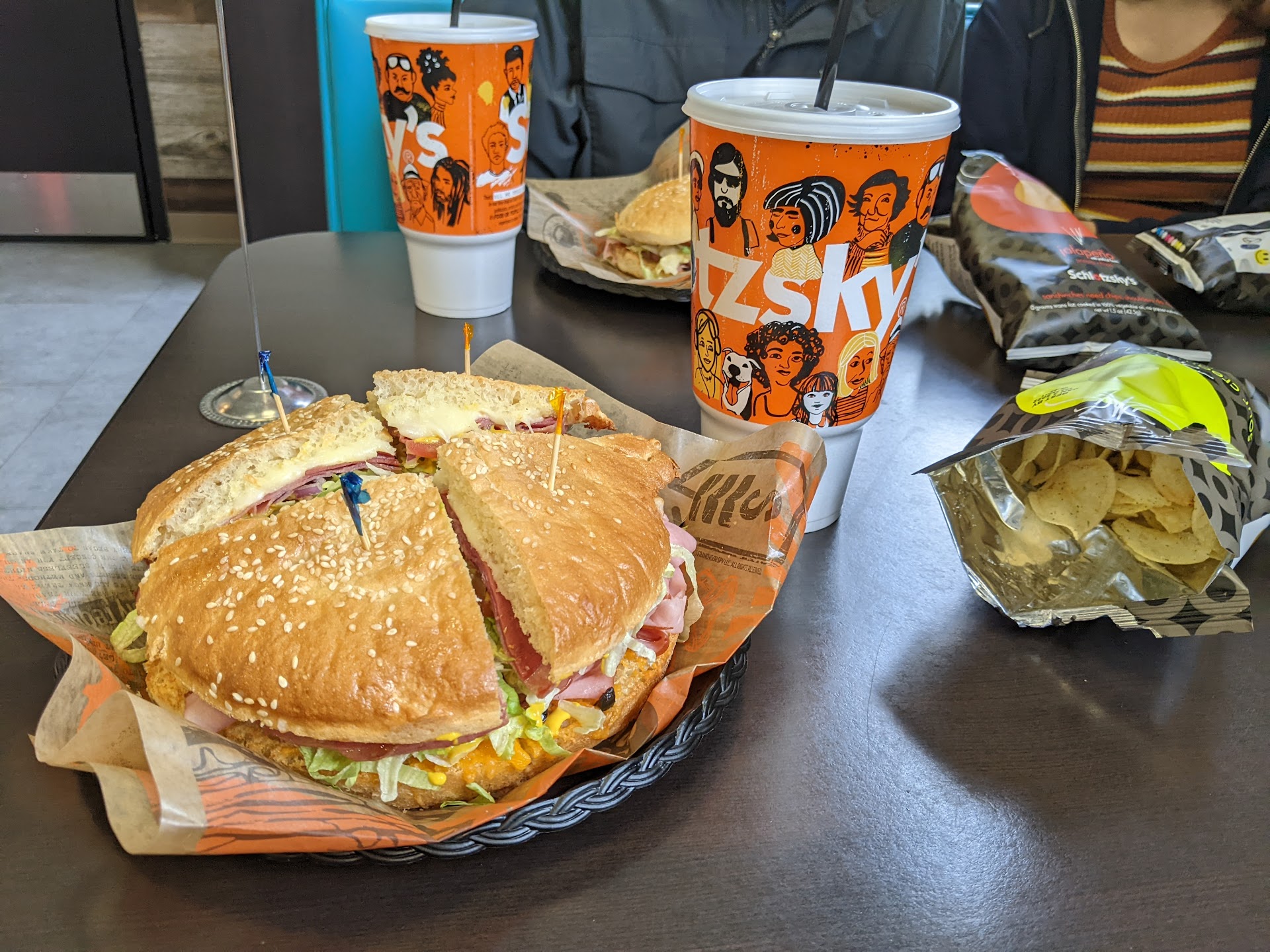 Read moreSchlotzsky's is a nice alternative to other national chain sandwich shops. This location is conveniently located next to one of the larger grocery stores in farmington. I really like the unique take on round sandwiches instead of defaulting to copying the sub sandwich format. Be warned that the large is monstrous in size! This location does a lot of drive-through business currently but we chose to dine in. The dining room is small but the staff did a good job with service. Bathrooms were clean and...
