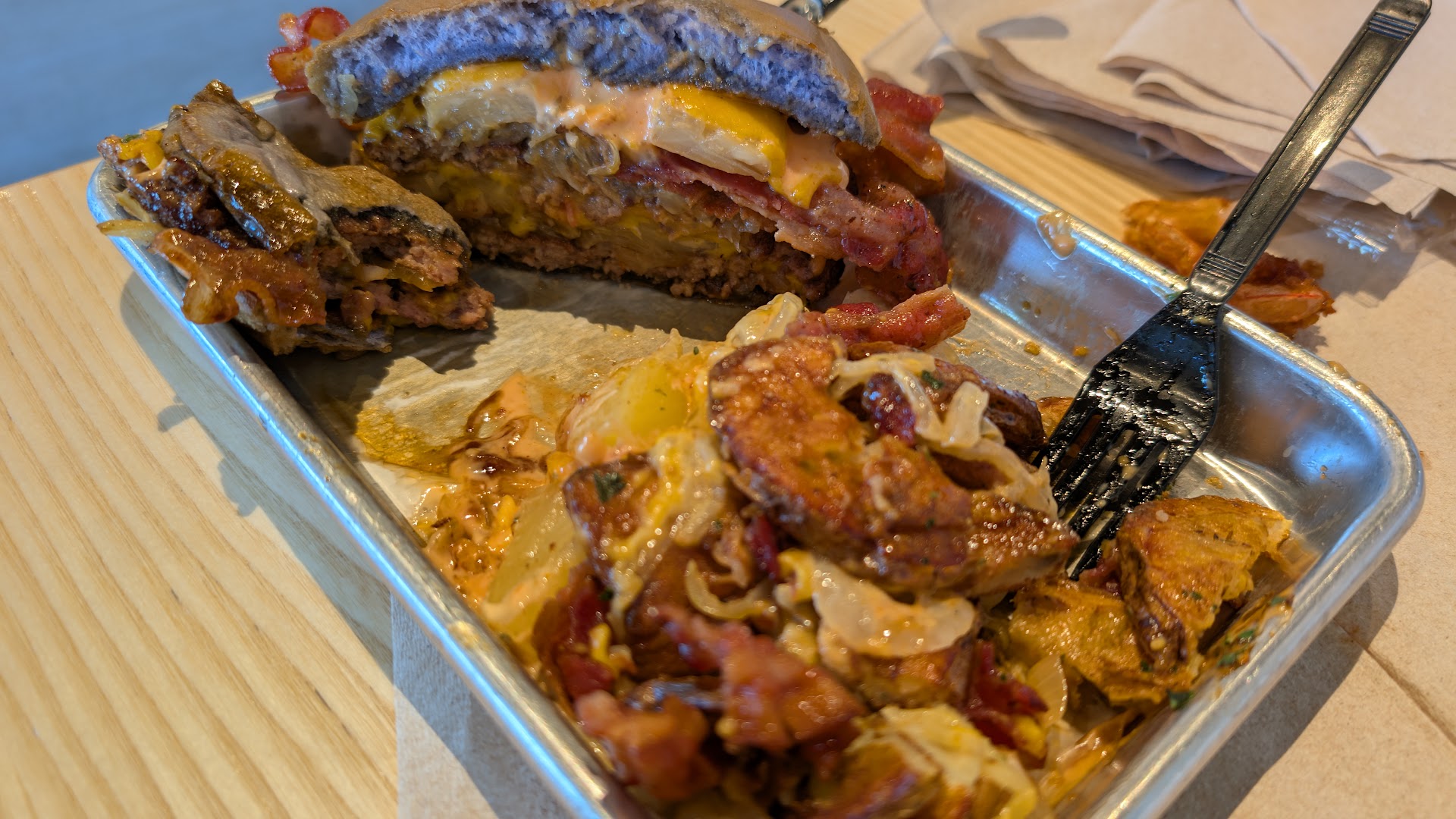 Oh darn! We were so excited to try this place out. Arrived before the big Friday rush. Walking in - decent but small location. Easy and straightforward ordering process. Go to fill up our drinks. Lids are out. No problem it happens. Next let’s find a spot - 3 -4 empty tables - not one is wiped down and clean. Place was not busy - it was steady. That’s fine - I can wipe down my own table. Food came out and the kid was nice enough. Food looked ok - American cheese (that’s McDonald’s cheese IMHO - I should have asked if there were options) - I got the basic fries - my son got the crazy fries. Here’s the good part: burger buns are good, the avocado that was added to my burger was good. Here’s the bad part: not one thing was hot, not one thing was warm, it wasn’t cold but it definitely was not warm. not in my meal or my sons. The crazy fries? Only messy layer of onions, sauce, and cheese on chip style fries (which when done well are so good)… nothing warm. One messy layer (non warm) of toppings. Dr Pepper was good though. Not a huge fan of leaving long or bad reviews. But I don’t think that for the price, the hype that the food shouldn’t be warm, tables shouldn’t be wiped and lids to drinks shouldn’t be out. Really fun idea. Who doesn’t love Hawaii in Utah? Could I have told the kids working? Sure but that would fall...