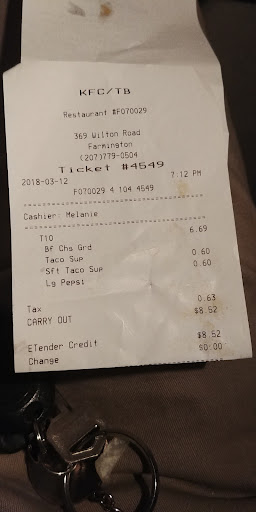 Read more3.5/5 This place looks significantly nicer than it did when I went in a long time ago, so that's good. The cashier was really pushing the whole survey thing on the recepit, but I shouldn't expect anything less I suppose. As far as food goes, it was certainly better than the kfc I got. I ordered a T10 which came with 3 tacos. I got a hard shell, a hard shell with a pancake thing around it, and one with just the pancake thing. They were just like an average taco but I got to choose between chicken, beef, and steak. So it came with my choice of meat. Lettuce, tomato, sour cream and cheese. It was pretty good but the T10 which came with a large soda was roughly $8.50, but it did cost a bit extra to make my tacos "supreme" but for $8.50 you could go out and buy the ingredients and make your own taco so you pay out the nose for convenience. But I thonk I'll come back, taco bell. You did not...