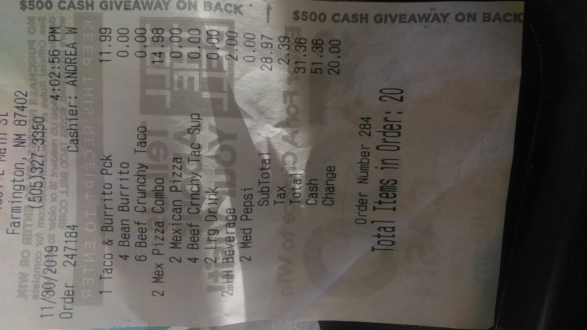 Read moreSo I ordered the taco and burritos ok I asked for two bean burritos and the rest crunchy tacos I swear I go to the front to speak with manager and she has a huge line. She leaves her big line and interferes with the manager and my conversation, then starts touching my hand and receipt, like lady really.... Ugh then I told the manager thanks and she's mumbling I'm sorry I'm like you have a line of people lady. She looked at me if looks could kill. I know how it feels to work in the fast food business I was in that position for four years just couldn't believe this lady... Food was delicious...