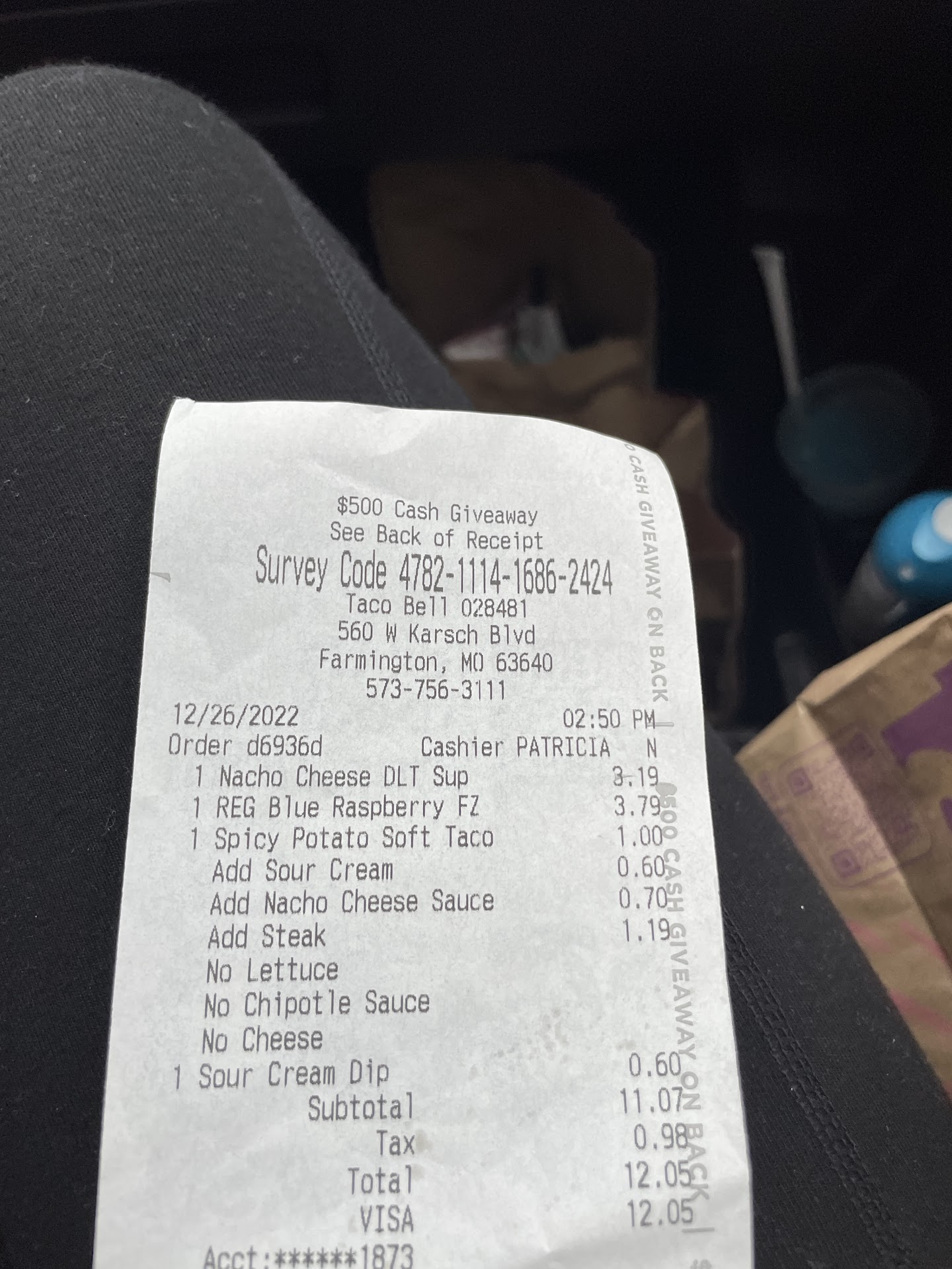Read moreFood is great and customer service is excellent. I came in and ordered the new promotional burrito - the triple cheese nacho burrito - along with 2 cheesy potato soft tacos and the naked chicken chalupa box; I've always considered them breaded because naked would suggest no breading. They food was good as always. However, they did forget my chalupa box. I've worked in fast food before so I know how faced paced it can be. Since I dined in, I wasnt too concerned with waiting to get my box as I had food to occupy my wait time. My personal experience as an employee at this Taco Bell, I know there are a lot of things that would need to be changed to increase productivity such as Windows XP being the main operating systems of their kiosks for inputting customers orders. As a repair technician Windows XP hasnt had updates since April of 2014. It would be very beneficial to upgrade. However, most of the people that make those decisions only see the accounting perspective but dont understand its impact on a break-even analysis. The customer is the priority; without them, the business does not work. Overall as far as a customer experience, it was great and will continue to go as long as they remain a business here...