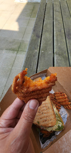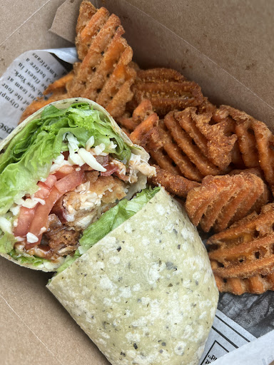 Read moreVegan friendly café. They have vegan cheese! Yay! Vegan Sandy panini was such a cheezy melty toasty treat. There is also a vegan chkn tenders wrap on the menu. The sweet potato waffle fries are next level. Real hunk of sweet potato waffle ironed and crisped to perfection. Quite literally the best sweet potato fries I've ever had in my life. Seasoned salt sprinkled on them, but they'd be awesome with cinnamon sugar dusted as a sweet treat. Strawberry smoothy slaps, perfect sweet strawberry flavor. Quite a line up of coffee drinks as well. Maple cinnamon sugar cold brew is calling me back very soon! If you have children, there's a small inside play area for them. Plenty of room, ample seating or take away. Right beside a public ( free) parking lot. All central to downtown, easy stroll to other shops, banks,...