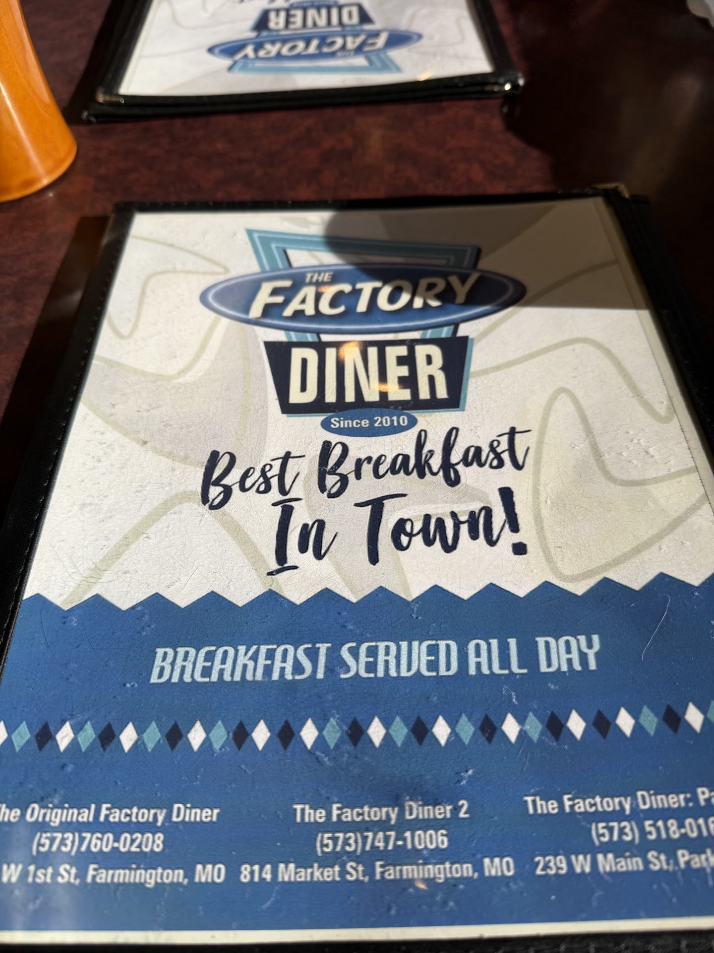 For a place that boasts itself as the "best breakfast in town", we were a little disappointed to be served a merely mediocre meal. The portions and prices were reasonably good, and the servers were friendly and accommodating. Due to COVID-19 we did have to wait for a table to open up but we were seated in only 7 minutes (Sunday morning, around 9 am). The disappointment lied in the food itself which was average at best. We experienced room temperature french toast, hash browns, and cold bacon. Our food was pretty basic and bland, but the bacon was cooked to perfection, perfectly crisped, which is a technique I have yet to master. The coffee was delicious to drink as we had our booties stabbed by the springs poking through the seat cushion holes. It's okay though since I'm used to having things in my butt. All in all, I would eat at Factory Diner 2 again as it is the only breakfast chain offered in Farmington (making its claim to fame as the "best breakfast in town"...