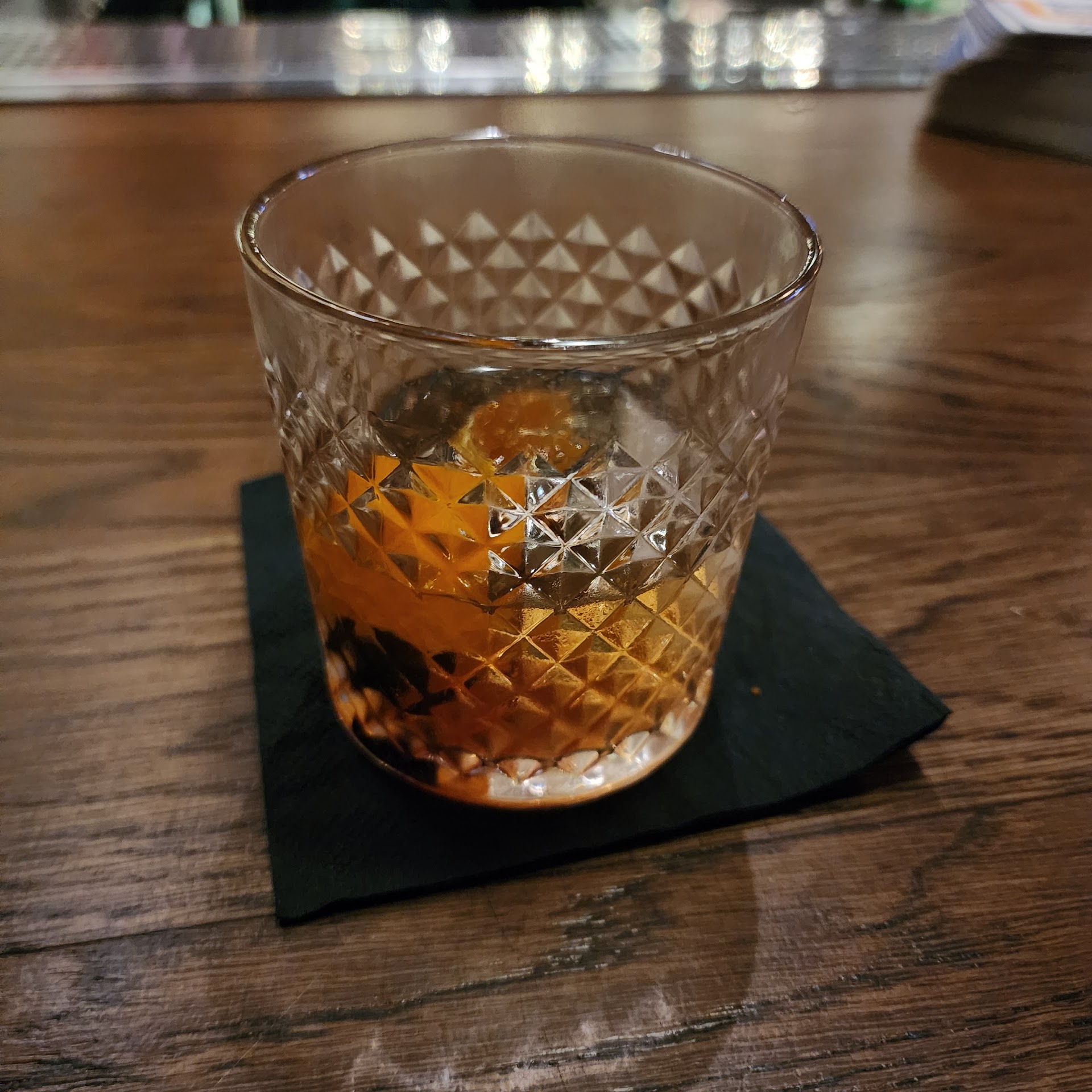 Very cozy local bar! Staff is very professional and personable. The bar side is separated from George's pizza restaurant, which is nice to know there are multiple ways to dine. My husband and I came for drinks and appetizers. The old-fashioned Tony made for us was crafted beautifully. He made the drink with finesse that showed he was versed in his craft. (Eta, my drink was full and delicious. I only thought to photograph it after I started drinking it). In the video, I filmed him creating an expresso martini (he did exquisitely dress them with expresso beans after I cut the video). Our apps were the coconut shrimp and jalapeƱo poppers. The coconut shrimp was delightful and cooked very nicely. It also came with a flavorful dipping sauce. The poppers were good, and as an app, both were portioned appropriately. Cannot wait to return and try more of the food menu as well as enjoy the inviting feel of this well...