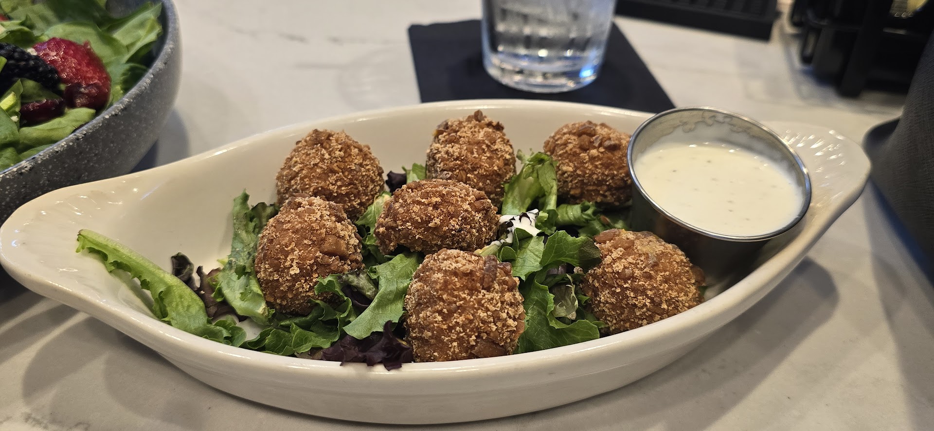 However, I had to give the food a 1 star 🌟 overall. I would give the food no stars if it weren't for the cheese bites. I am not an overly picky person and definitely not a food connoisseur. I went with something new and something I knew for this visit. I had the Mixed Berry Salad during my latest visit which I have had before. Upon initial inspection of the Salad the fruit and Spinach looked a bit old. After applying the Apple cider vinegarette dressing (which is very sweet and didnt taste like the vinegarette I've had at all the last time I ate this) I mixed it around. I found the Spinach was wilted underneath the majority of the Salad and it did not seem that the Spinach had been cleaned prior to serving. It almost had the right out of the bag or container taste. The Salad seemed to be missing ingredients as well. It did not have the sunflower kernels.