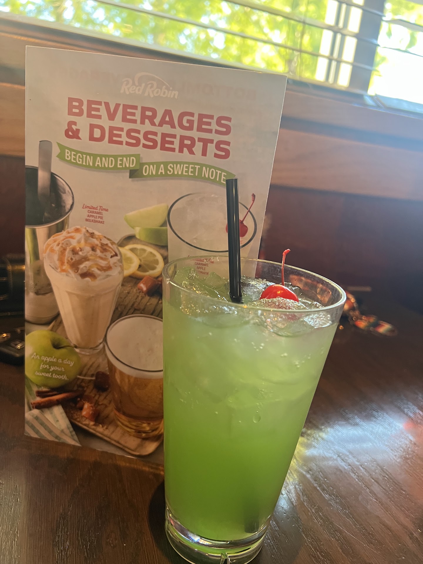 I tried a (limited time) CARAMEL APPLE LEMONADE The flavors of granny smith apple and spiced brown sugar pair with Minute MaidĀ® Lemonade for a seriously festive refreshment. $4.99. In MY opinion it was GROSS! I couldnāt get past the spiced brown sugar taste. I asked Delaney if I could switch it for SUNSET LEMONADE Minute MaidĀ® Lemonade, citrus juice, pineapple juice and desert pear flavor. $4.99 (Both are under the bottomless beverages for $4.99) Iāve had this one before & knew Iād like it!