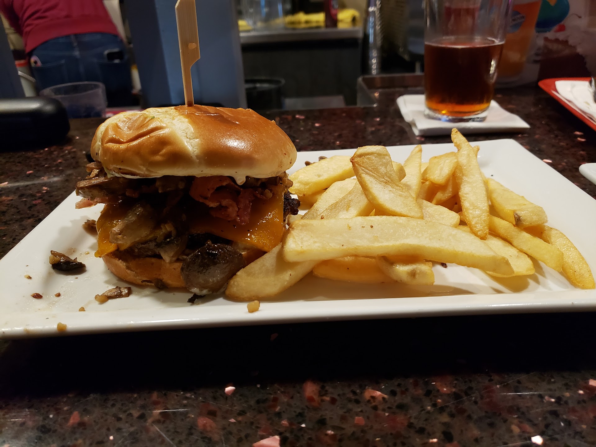 I ordered the THE SOUTHERN CHARM Crush on this: Brown-sugar-glazed patty, hardwood-smoked bacon, Whiskey RiverĀ® BBQ Sauce, cheddar, caramelized onion, lettuce and mayo. $14.99. I replaced the mayo with mustard. The caramelized onions were cooked PERFECTLY! *picture 3 & 4