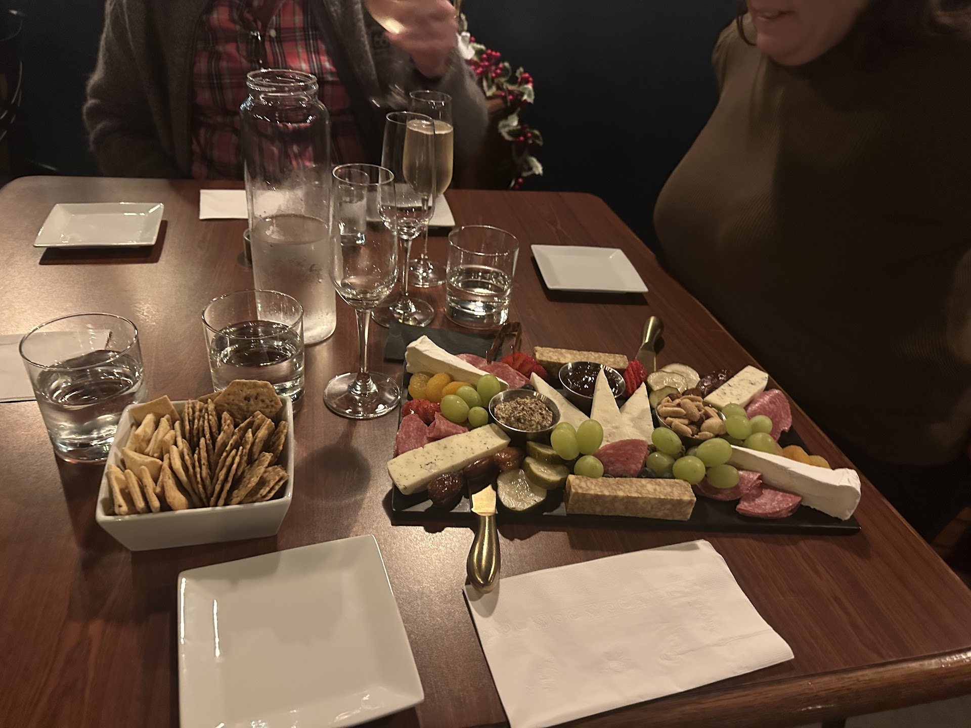 The wine selection is fantastic, and I love that you can enjoy a glass of bubbles (like Crémant or Prosecco) at half price during happy hour. On this visit, I tried the baked brie, which was delicious and perfect for sharing with a friend—it was plenty of food for two. We also shared the Featured Board (size large) with a group of four, and it was the ideal appetizer before dinner.